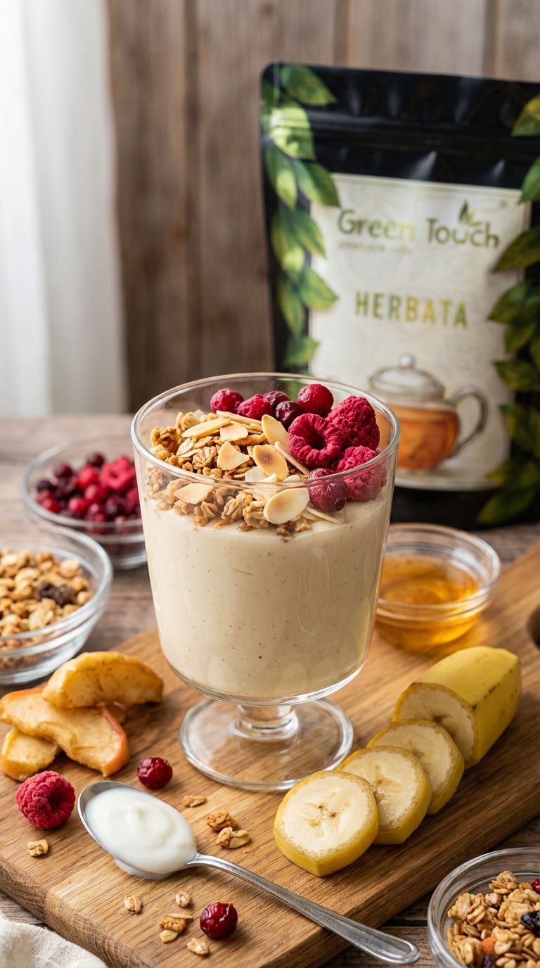 W blenderze zmiksuj banana, jabłko, jogurt, miód i napar z herbaty, aż powstanie gładki mus. Przełóż do szklanki lub pucharka. Na wierzch wsyp granolę, posyp liofilizowanymi owocami. Mus jest lekki, lekko waniliowy i idealnie owocowy – znakomity na zdrowe śniadanie lub lekki deser.