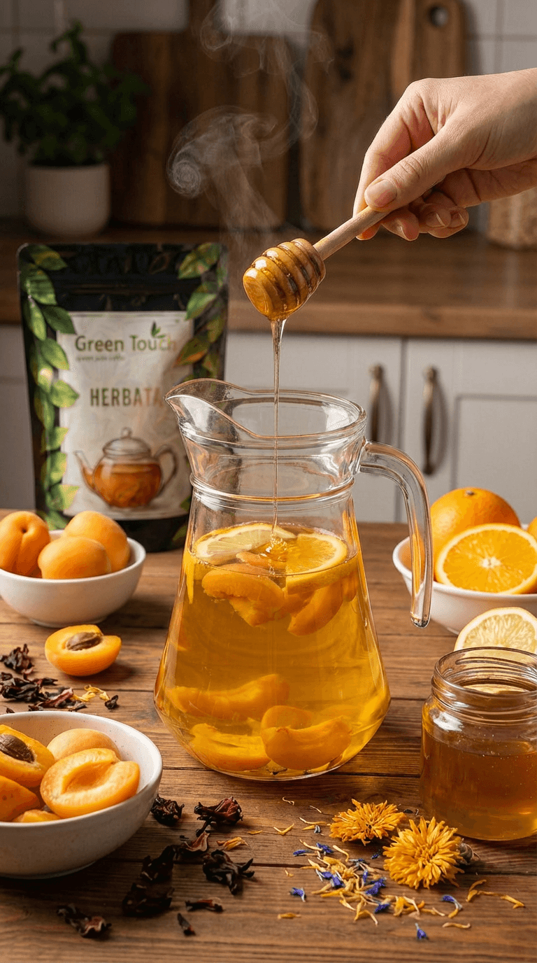 Do dzbanka z gorącym naparem dodaj pokrojone owoce, sok z cytryny i miód. Odstaw na 10–15 minut, aby składniki się przegryzły. Podawaj na ciepło lub schłodź i zaserwuj jako lekki, owocowy kompot. Dekoruj płatkami kwiatów. Smakuje jak ogród w filiżance!