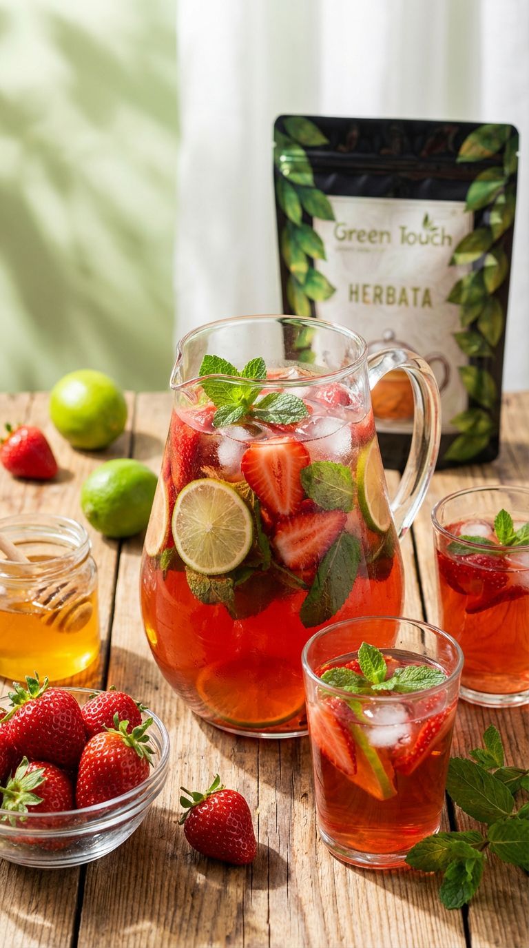 Zaparz herbatę według przepisu i pozostaw do ostudzenia. Truskawki przekrój na połówki, limonkę pokrój w plasterki. Do dzbanka włóż owoce, listki mięty oraz kostki lodu. Zalej wystudzonym naparem, dodaj miód i delikatnie wymieszaj. Odstaw na 10–15 minut, by smaki się połączyły. Napój będzie pełen naturalnej słodyczy, orzeźwienia i koloru – idealny na ciepłe dni.