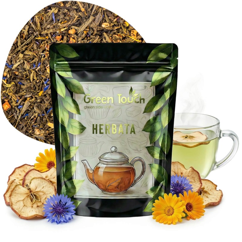 Poranna Aura to delikatna i harmonijna herbata zielona Sencha, która łączy w sobie świeżość zielonych liści i naturalną słodycz owoców. Kompozycję wzbogacają suszone jabłka, nadające naparowi lekko miodowej nuty, oraz płatki bławatka i nagietka, które wprowadzają subtelne, kwiatowe akcenty i czynią mieszankę niezwykle elegancką. To wyjątkowa zielona herbata sypana z dodatkiem jabłka i kwiatów, idealna na początek dnia. Jej smak jest łagodny, orzeźwiający i naturalnie słodki, dzięki czemu świetnie sprawdzi się jako codzienny rytuał o poranku – pobudzający, ale delikatny dla zmysłów.