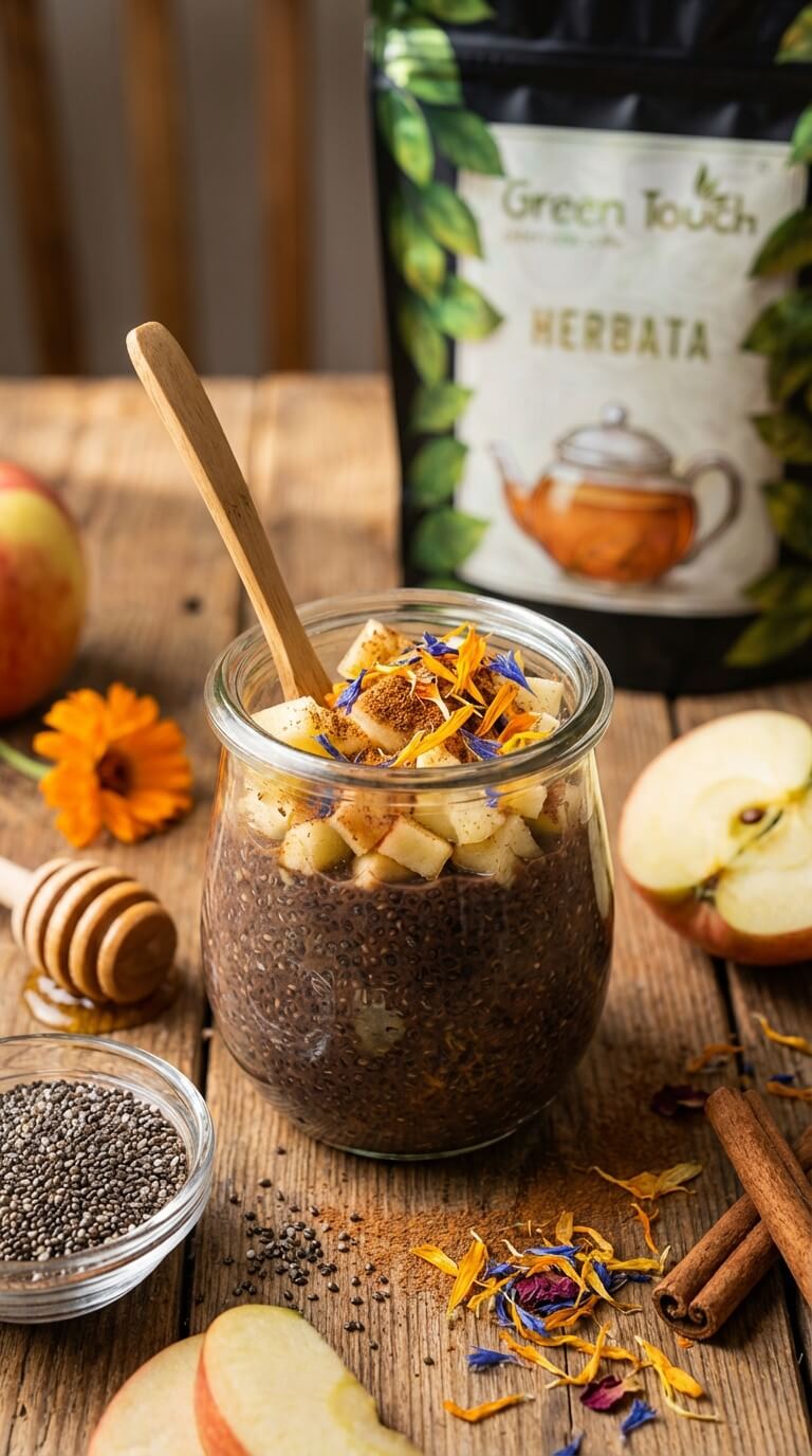 Do ostudzonego naparu dodaj nasiona chia i miód, dokładnie wymieszaj. Odstaw do lodówki na kilka godzin (najlepiej na noc), aż pudding zgęstnieje. Podaj z kawałkami świeżego jabłka, posyp odrobiną cynamonu i udekoruj kwiatami nagietka oraz bławatka. To lekki, zdrowy i efektowny deser, idealny na poranek w towarzystwie ulubionej herbaty.