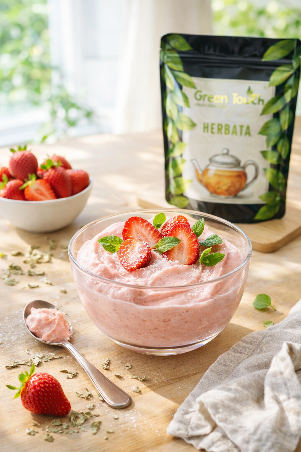 - Przed podaniem udekoruj deser świeżymi truskawkami, pokruszoną bezą lub herbatnikami oraz listkami mięty.