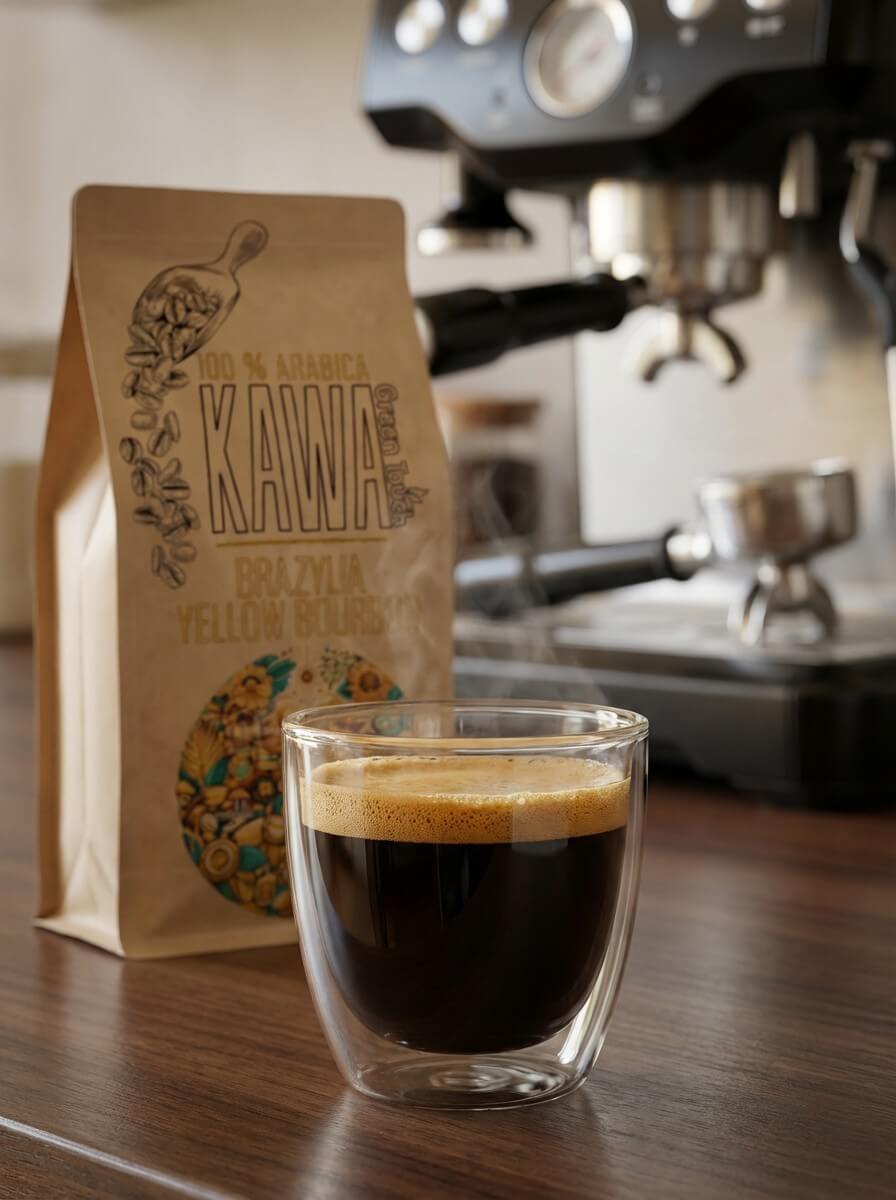 Brazylia Yellow Bourbon to kawa o wyraźnej słodyczy i niskiej kwasowości, z delikatną goryczką, idealna do picia na czysto lub z mlekiem.
