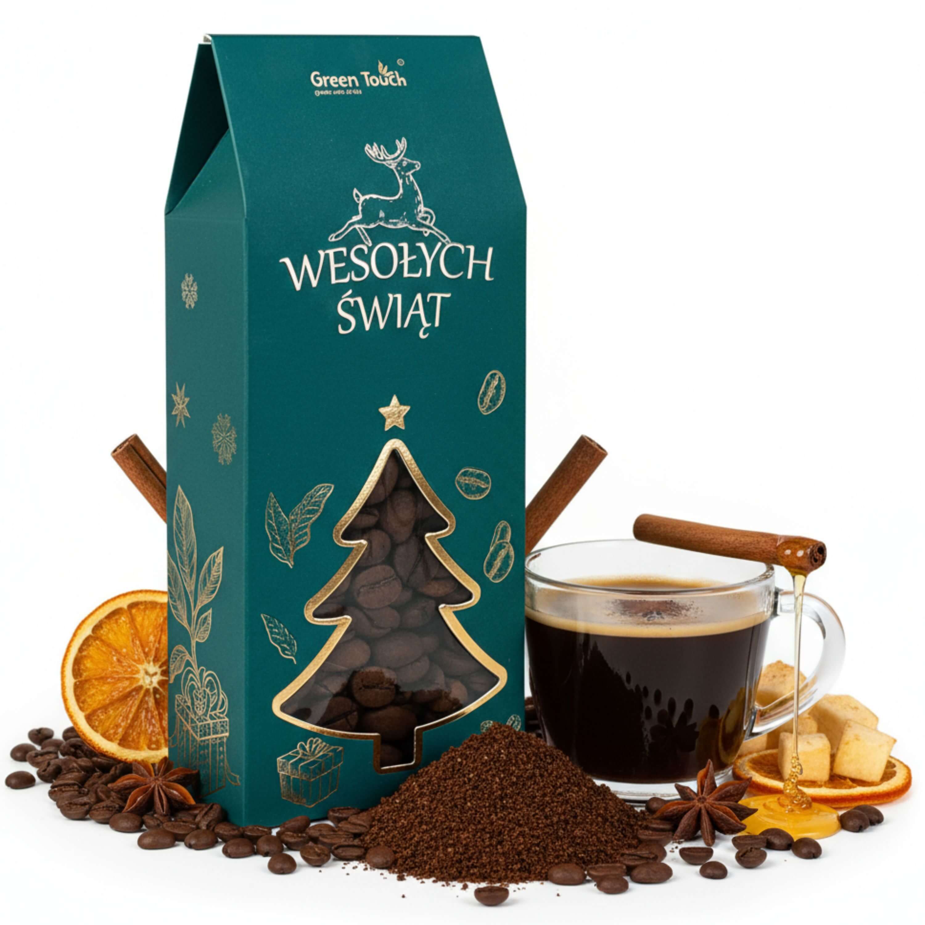 Składniki: Brazylia Santos 100% arabica (98%), aromat (2%). Kawa w świątecznym pudełku z napisem "Wesołych Świąt"