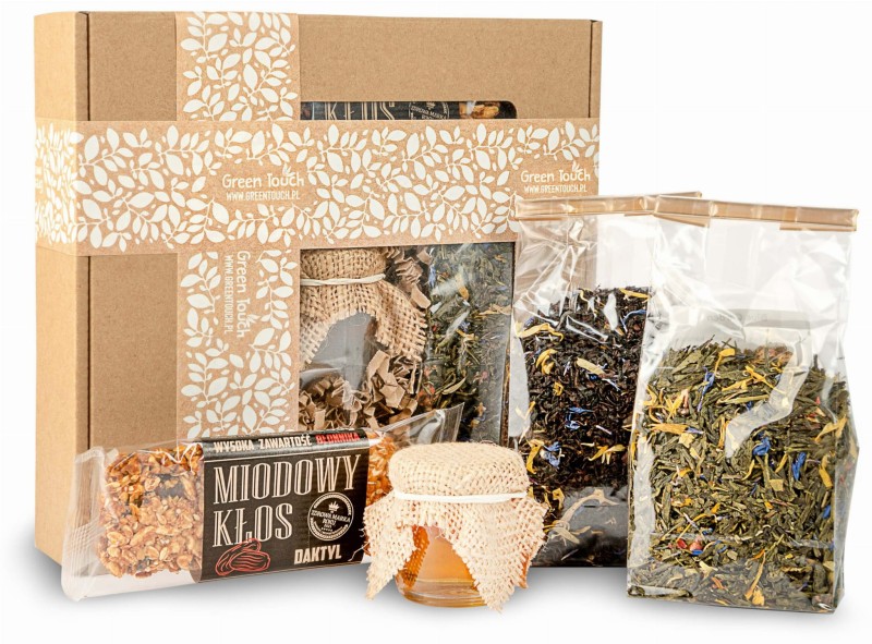 Zestaw herbat w pudełku z miodem i batonem na prezent
