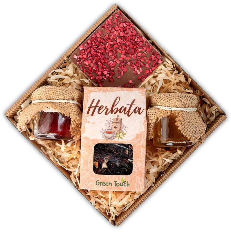 Naturalny upominek w postaci dobrej herbaty, miodu, konfiturki oraz ręcznie robionej czekoladki