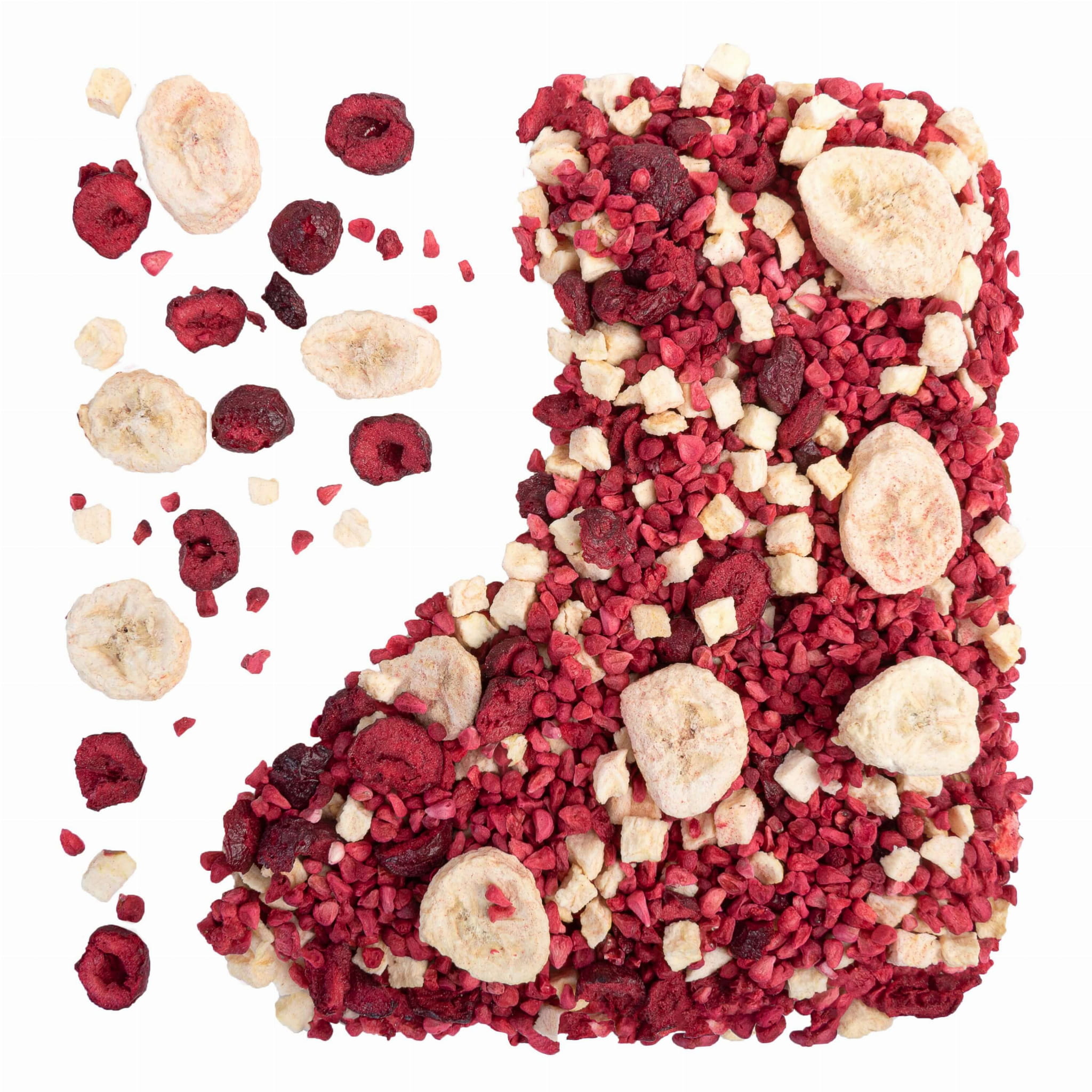 Nasze wiaderko wypełnione jest starannie wyselekcjonowaną mieszanką liofilizowanych owoców, która łączy w sobie zdrowie i wygodę. W skład tej mieszanki wchodzą: maliny, jabłka, wiśnie i banany. Liofilizacja, czyli suszenie przez sublimację, pozwala zachować większość wartości odżywczych owoców oraz ich naturalny kolor i aromat bez dodatku konserwantów.