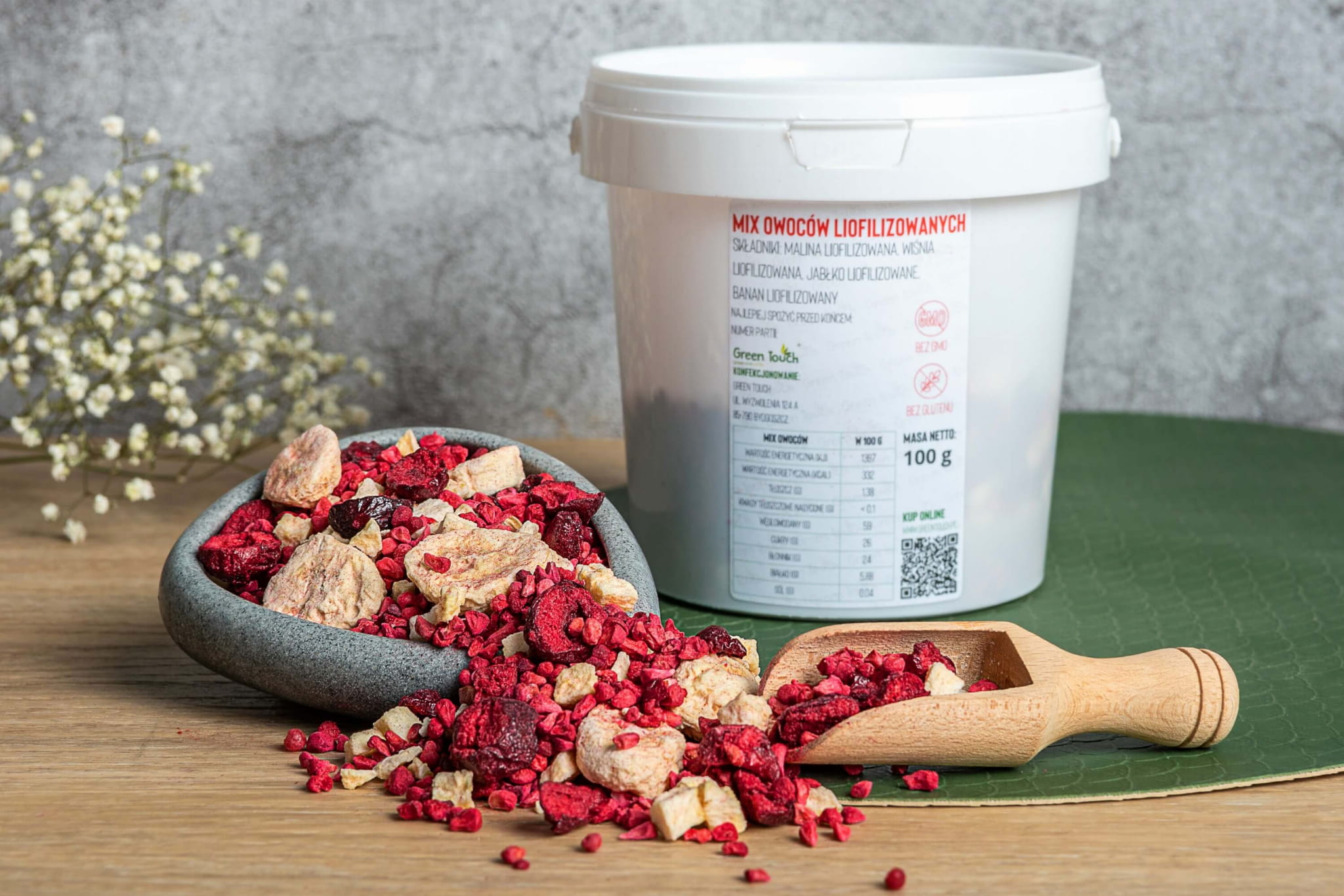 Owoce liofilizowane zestaw mix malina wiśnia jabłko banan 100 g wiaderko