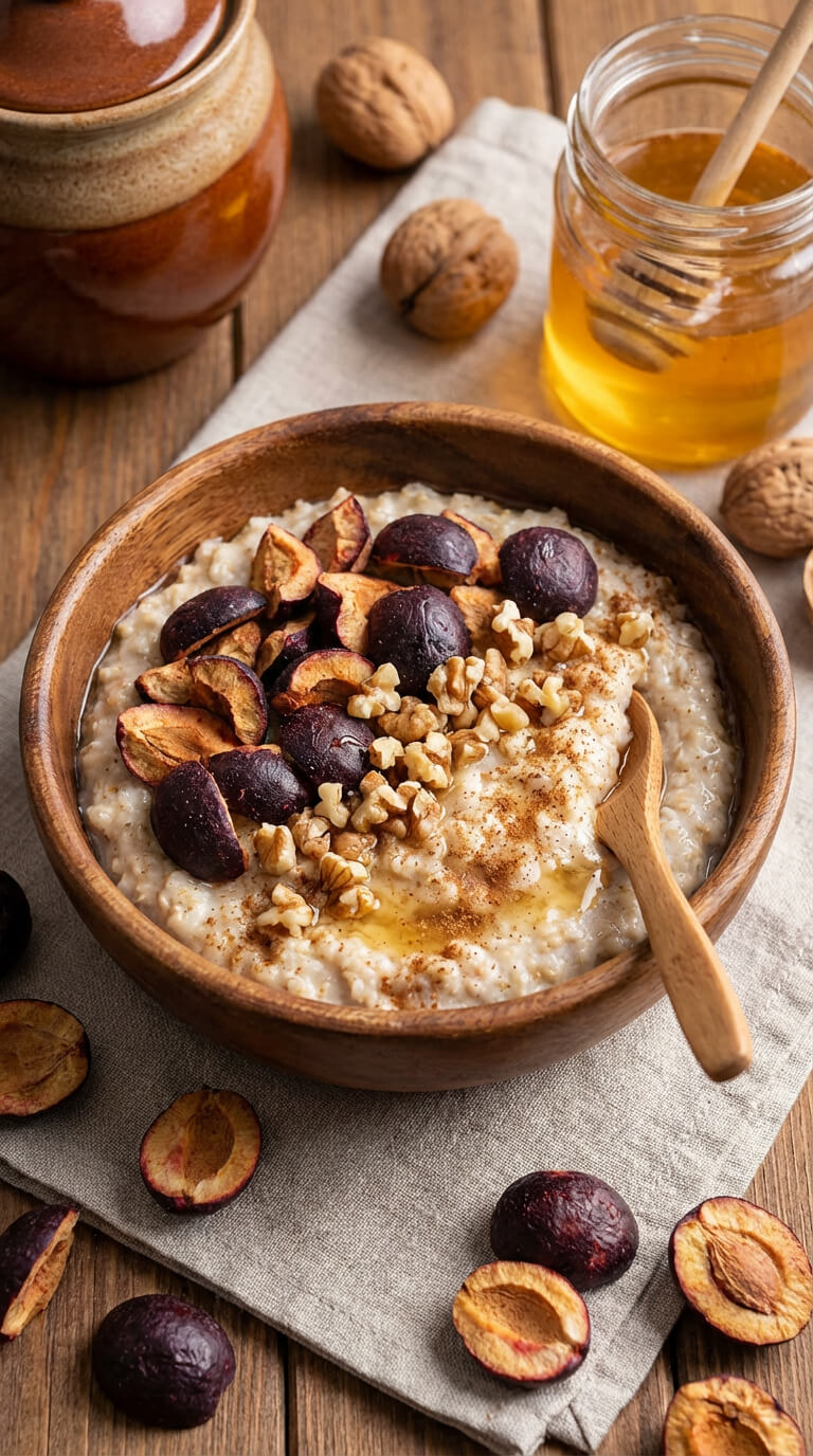 - przełóż owsiankę do misek i dodaj śliwkę liofilizowaną oraz orzechy