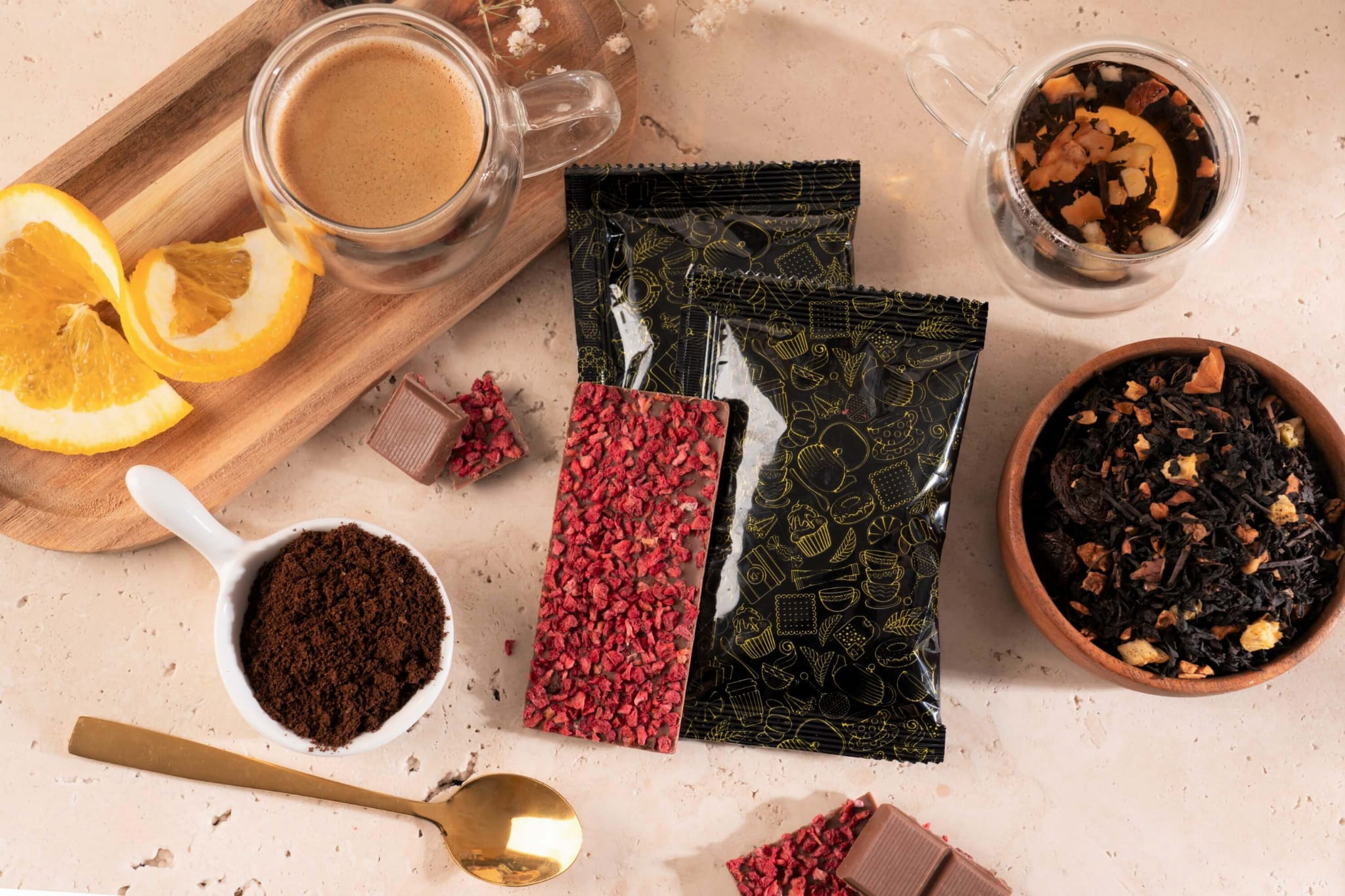 Zawartość podarunku jest niezwykle uniwersalna, dzięki czemu przypadnie do gustu każdemu, niezależnie od preferencji. Kawa ziarnista o wyjątkowym smaku pomarańczy w czekoladzie, herbata liściasta z wyczuwalną nutą szarlotki oraz czekoladka neapolitanka z dodatkiem owoców liofilizowanych – prosto, pysznie i z klasą!