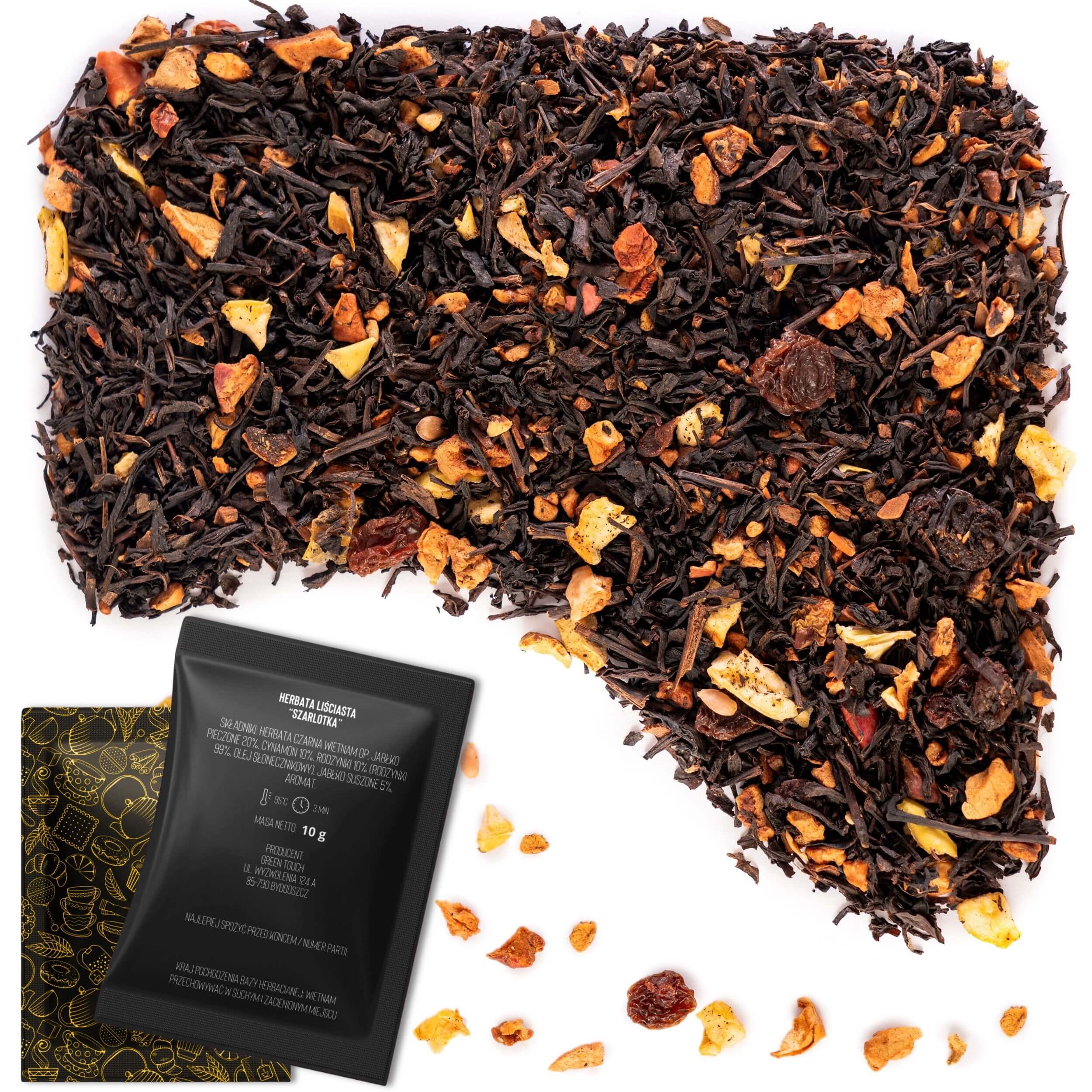 - Czarna herbata liściasta o smaku szarlotki. Doskonała mieszanka wysokogatunkowej czarnej herbaty z aromatycznymi dodatkami marki Green Touch 10 g w eleganckiej metalowej saszetce.
