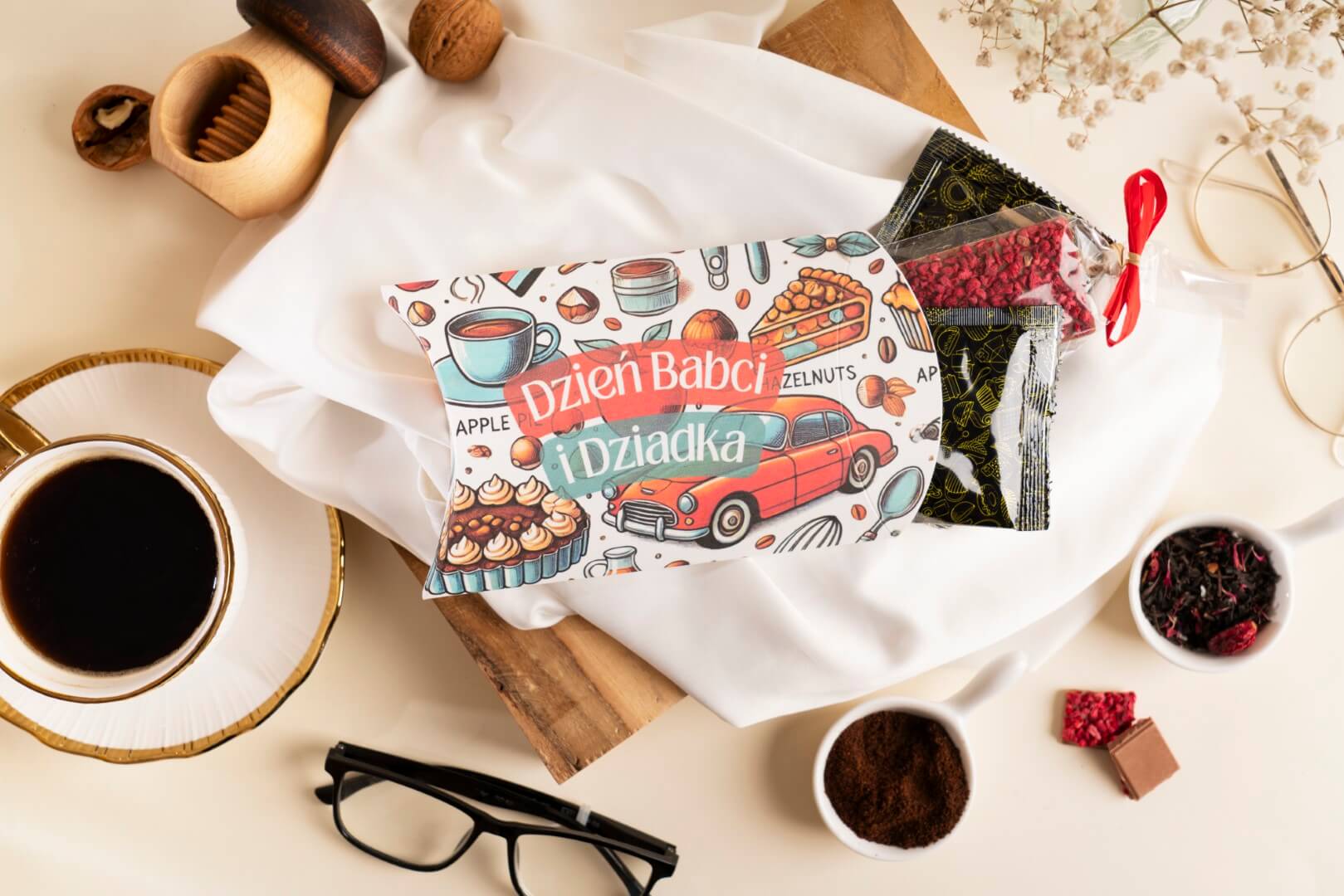 Pillow box z kawą, herbatą i czekoladą. Upominek ze słodką zawartością z okazji dnia babci i dziadka.