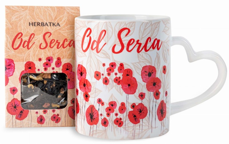 - Kubek 330 ml z uchem w kształcie serca oraz nadrukiem z motywem "Od Serca" - spójnym z herbatą