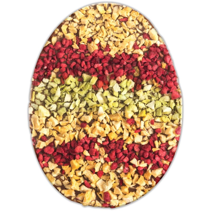 Pyszna czekolada mleczna w kształcie uroczego jajka - pisanki wielkanocnej o wadze 70 g. Ta wyjątkowa czekolada wykonana jest z najwyższej jakości składników, a dodatek różnych owoców liofilizowanych nadaje jej intensywny i niepowtarzalny smak. Kształt jajka pisanki to idealna dekoracja na świątecznym stole lub jako prezent dla najbliższych.