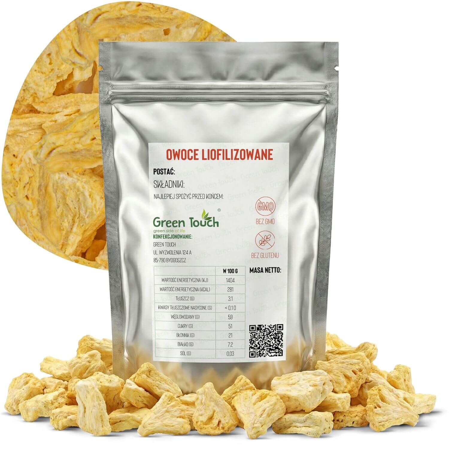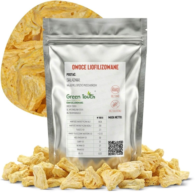 Duże segmenty liofilizowanego ananasa Green Touch to wygodny sposób na dodanie tropikalnej nuty do codziennych potraw. Efektowna forma sprawia, że owoce świetnie prezentują się w deserach i miskach śniadaniowych, a jednocześnie pozostają lekką, chrupiącą przekąską.