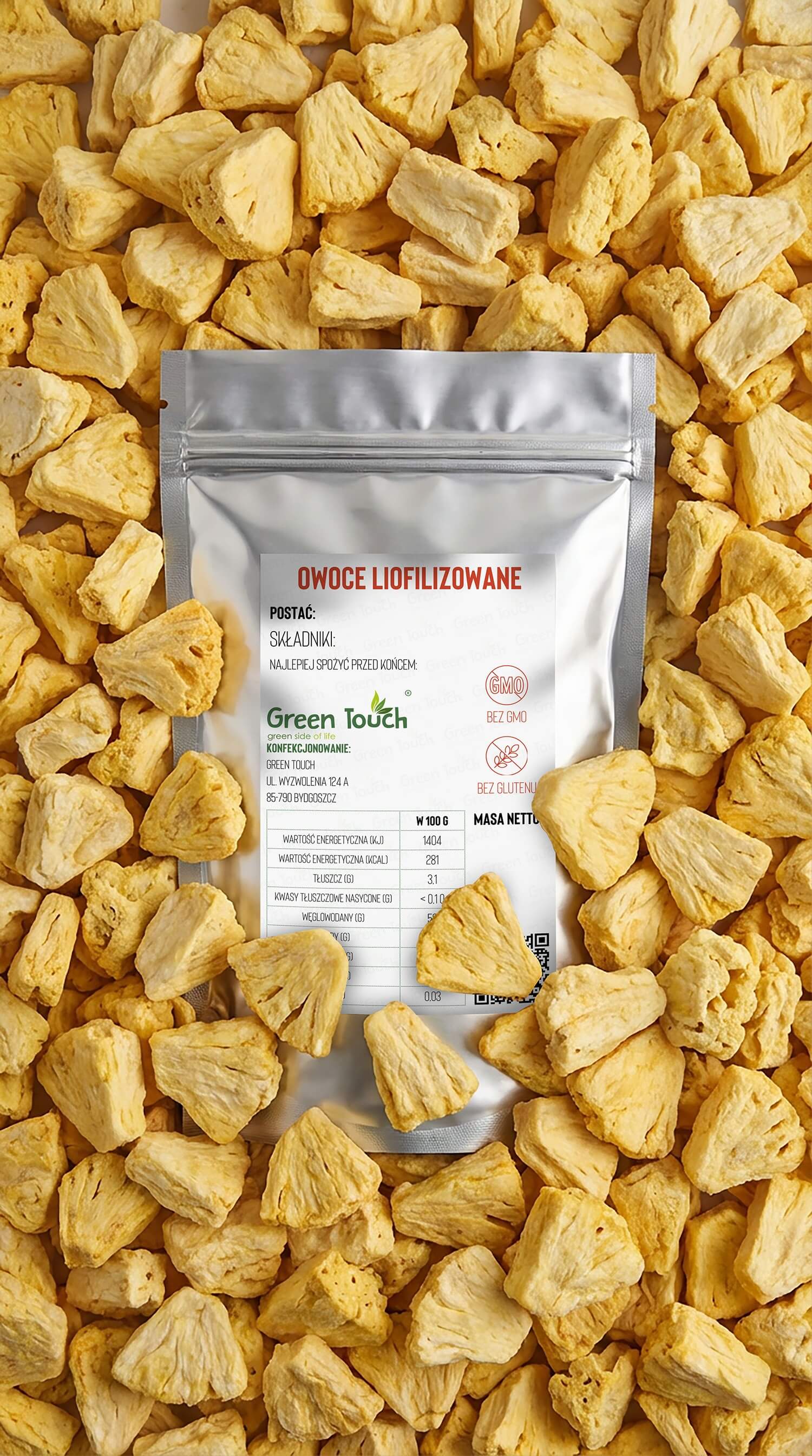Liofilizacja to proces suszenia owoców w niskiej temperaturze, który pozwala zachować ich naturalne właściwości, smak oraz wartości odżywcze. Dzięki temu ananas pozostaje lekki, chrupki i aromatyczny, a jednocześnie trwały i wygodny w przechowywaniu, bez potrzeby stosowania konserwantów.