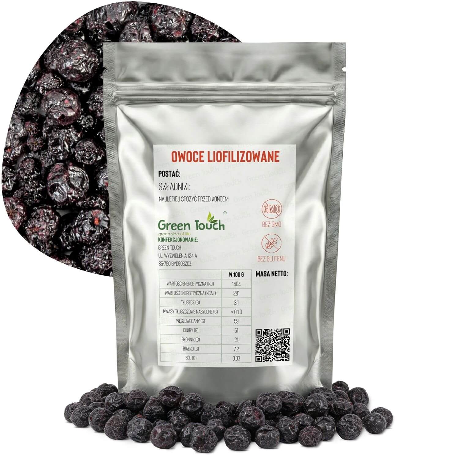 Aronię liofilizowaną pakujemy w metalizowaną torebkę typu doypack, hermetycznie zgrzewaną, z praktycznym zamknięciem strunowym. Takie opakowanie chroni produkt przed wilgocią i utratą aromatu oraz umożliwia wielokrotne otwieranie i zamykanie bez pogorszenia jakości.
