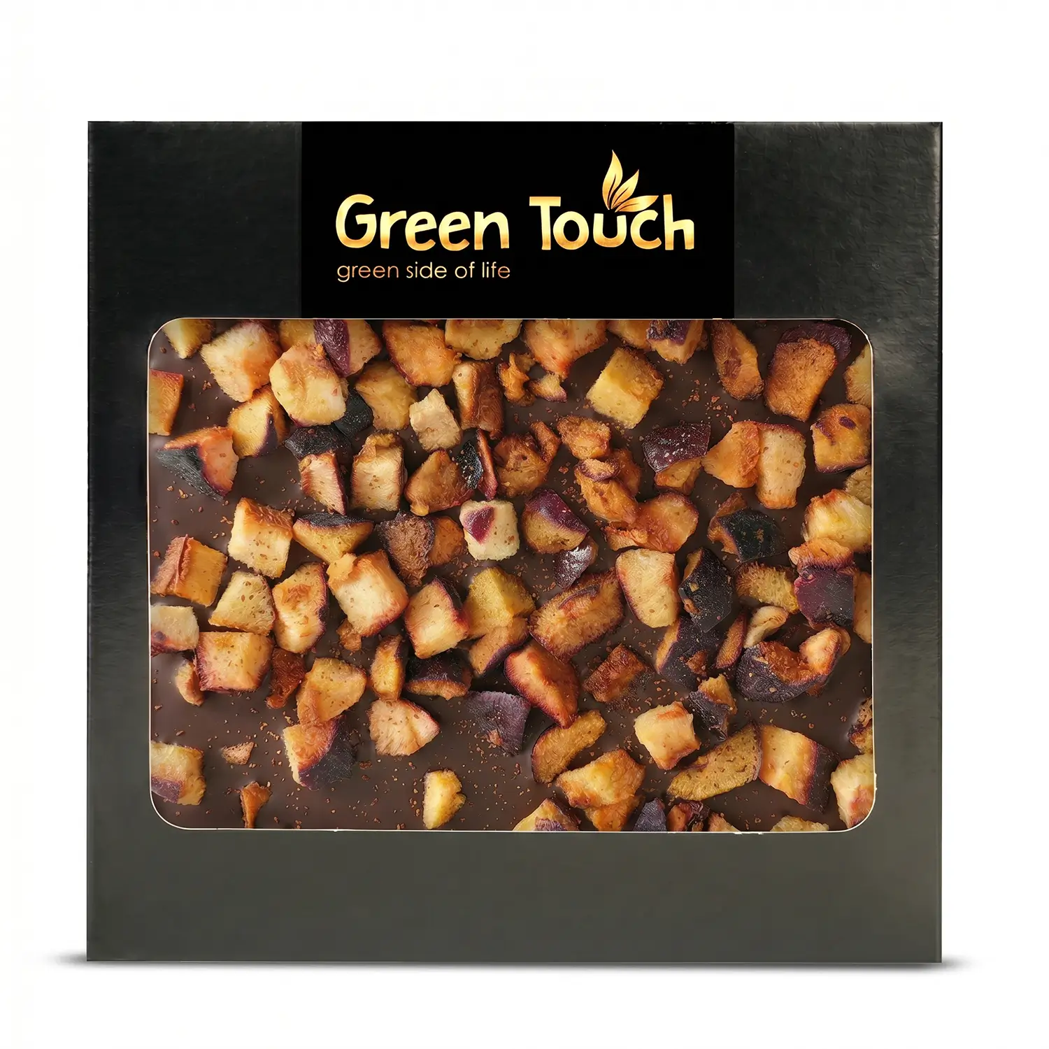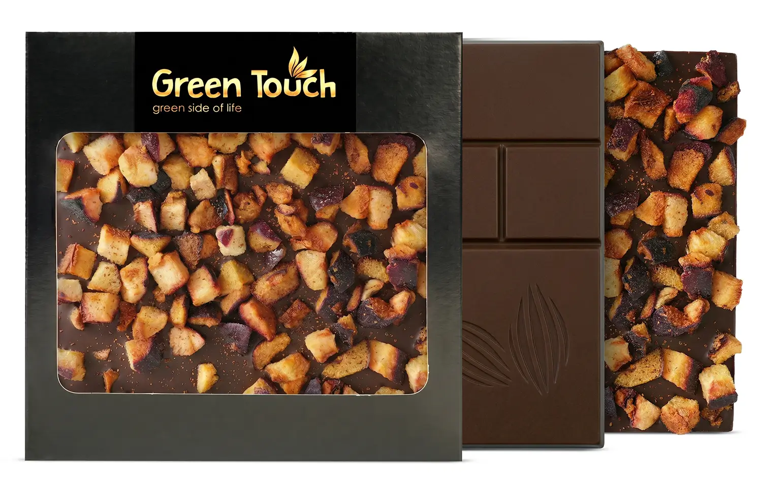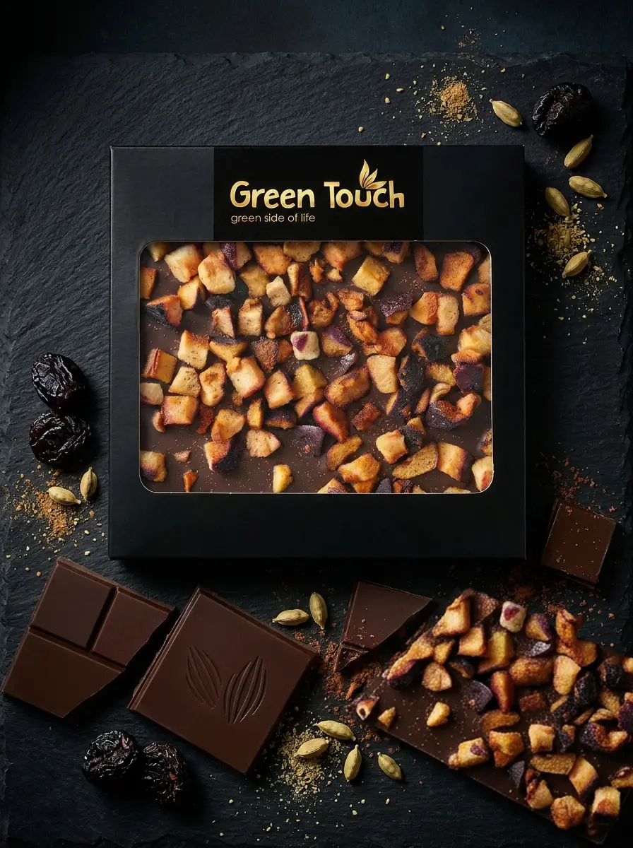 Green Touch to marka, która łączy dopracowaną estetykę z ciekawymi kompozycjami smakowymi. W tej tabliczce intensywna ciemna czekolada 70% kakao została połączona z dodatkiem śliwki liofilizowanej i kardamonu, dzięki czemu całość zyskuje bardziej wyrafinowany, owocowo-korzenny charakter.