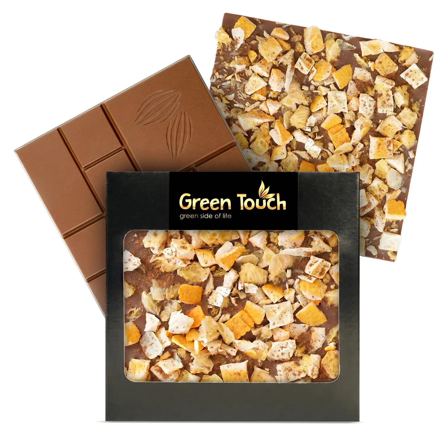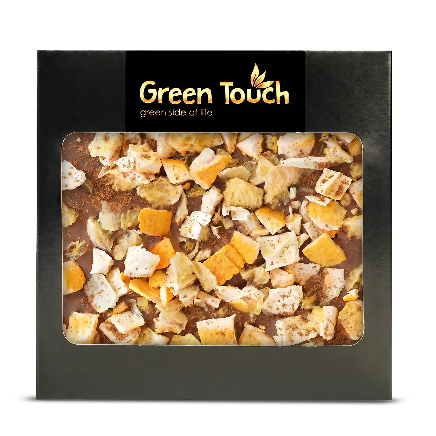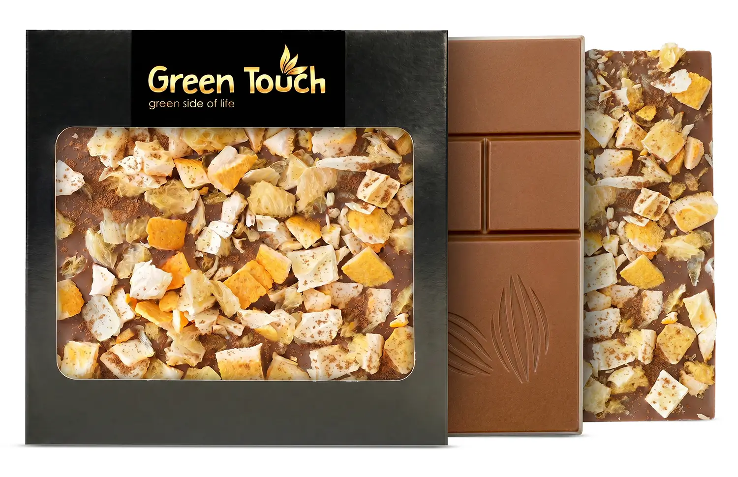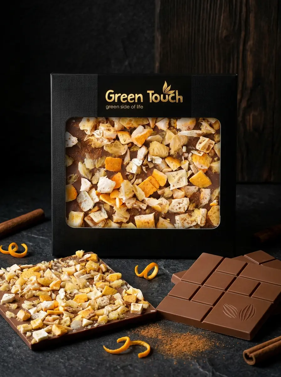Green Touch to marka, która łączy dopracowaną estetykę z ciekawymi kompozycjami smakowymi. W tej tabliczce delikatna czekolada mleczna została połączona z liofilizowaną pomarańczą ze skórką i cynamonem, dzięki czemu całość zyskuje bardziej aromatyczny, deserowy i świąteczny charakter.