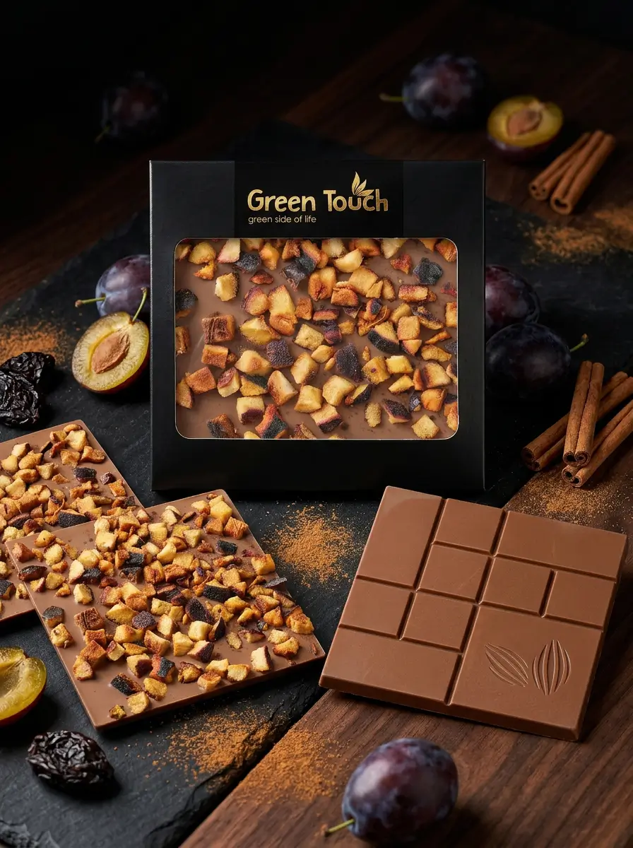 Green Touch to marka, która łączy dopracowaną estetykę z ciekawymi kompozycjami smakowymi. W tej tabliczce delikatna czekolada mleczna została połączona z liofilizowaną śliwką i cynamonem, dzięki czemu całość zyskuje bardziej owocowy, lekko korzenny i bardzo przyjemny deserowy charakter.