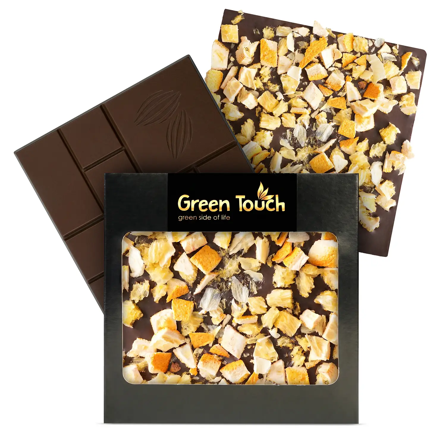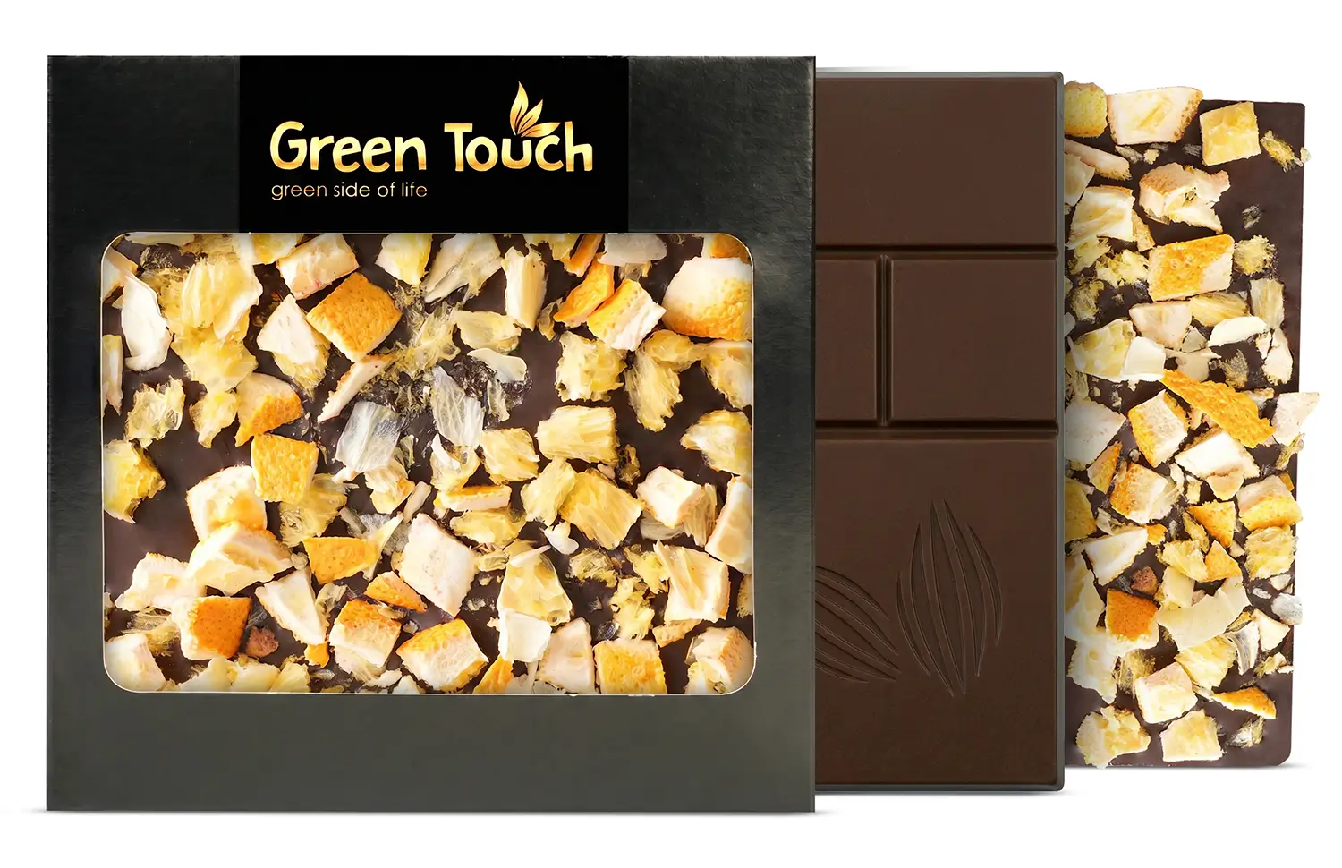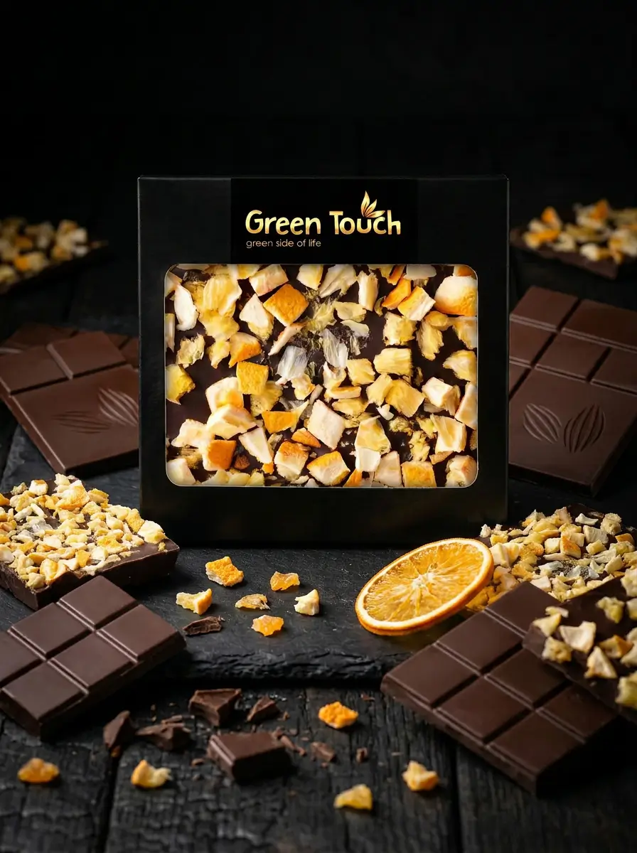 Green Touch to marka, która łączy atrakcyjne kompozycje smakowe z estetycznym wykonaniem i elegancką formą podania. W tej tabliczce klasyczna ciemna czekolada 70% kakao została połączona z dodatkiem pomarańczy, dzięki czemu całość ma bardziej świeży, owocowy i lekko wytrawny charakter.