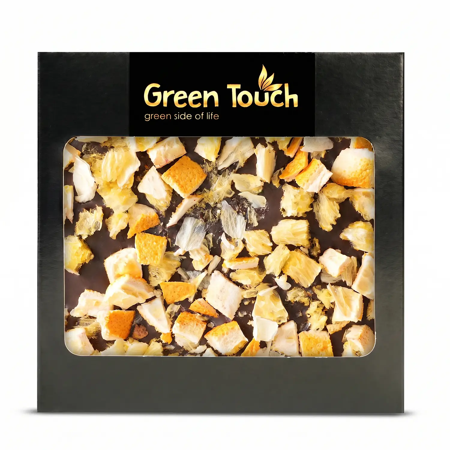 Wspólne dla tej linii jest stylowe opakowanie marki Green Touch o wymiarach 12,5 x 12,5 cm. Kartonik ma elegancki, ciemny wygląd z dużym okienkiem z przodu, dzięki któremu dobrze widać tabliczkę i jej dodatki. Taka forma prezentacji podkreśla premium charakter produktu i sprawia, że czekolada świetnie nadaje się także na prezent.