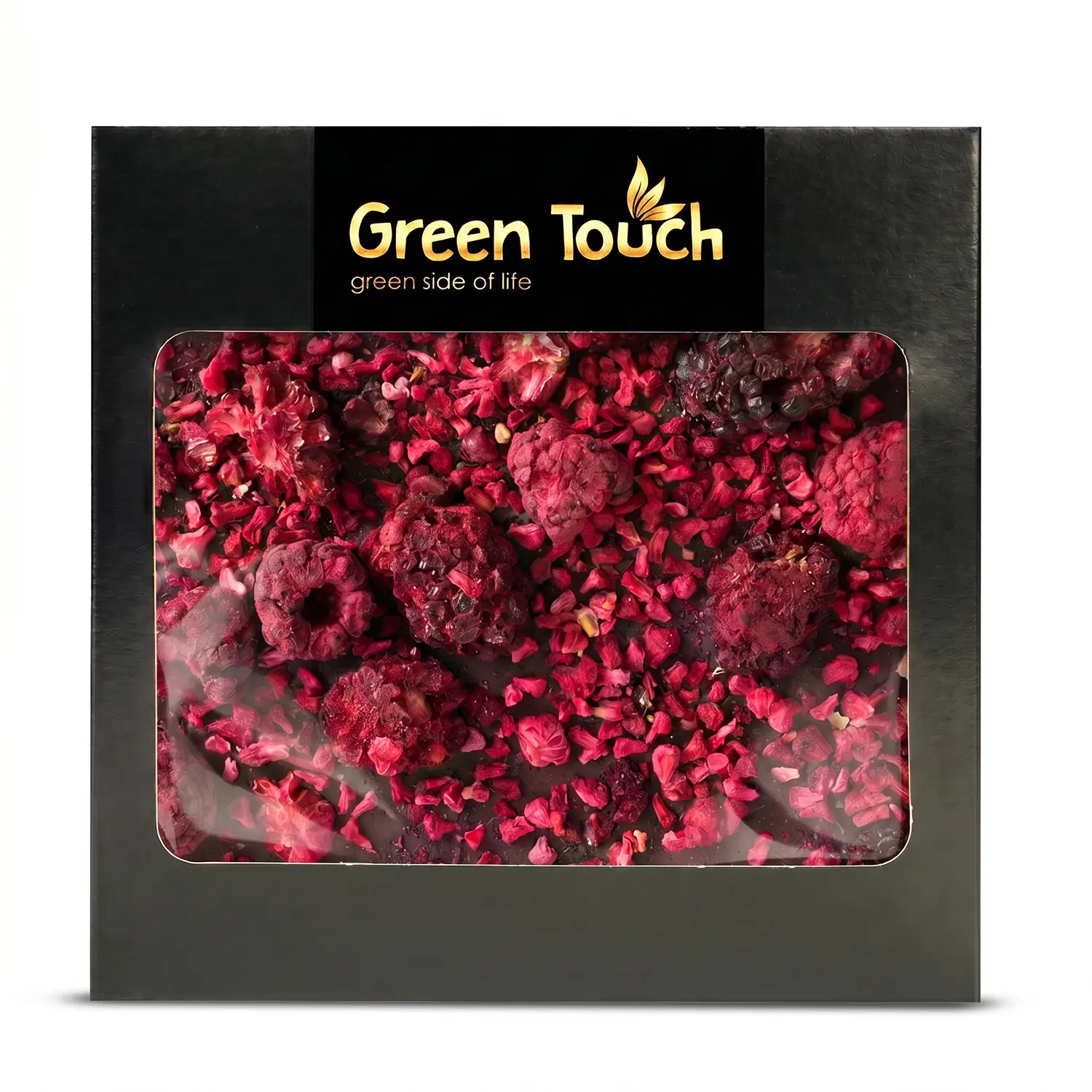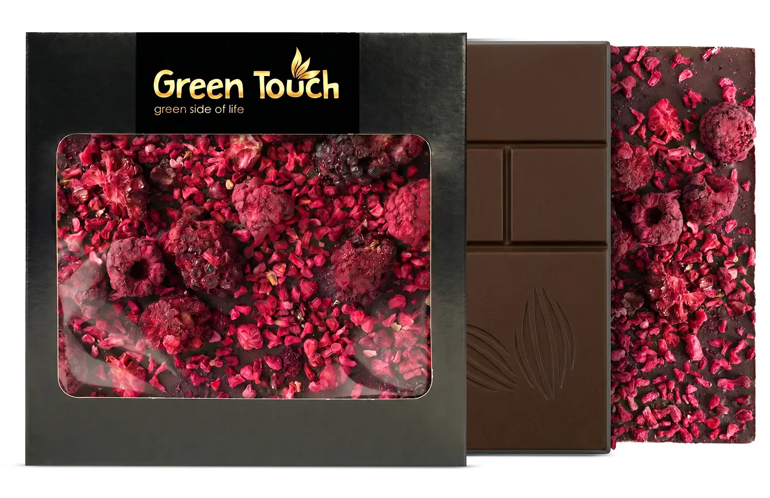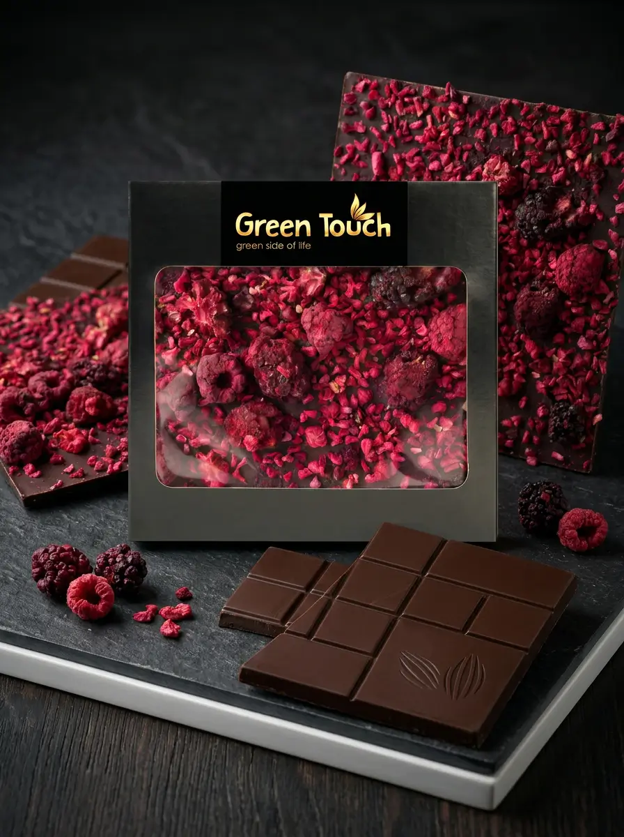 Green Touch to marka, która łączy ciekawy smak, estetyczne wykonanie i nowoczesną prezentację produktu. W tej tabliczce klasyczna ciemna czekolada 70% cacao została połączona z owocami liofilizowanymi, które nadają jej bardziej świeżego, owocowego i atrakcyjnego charakteru.