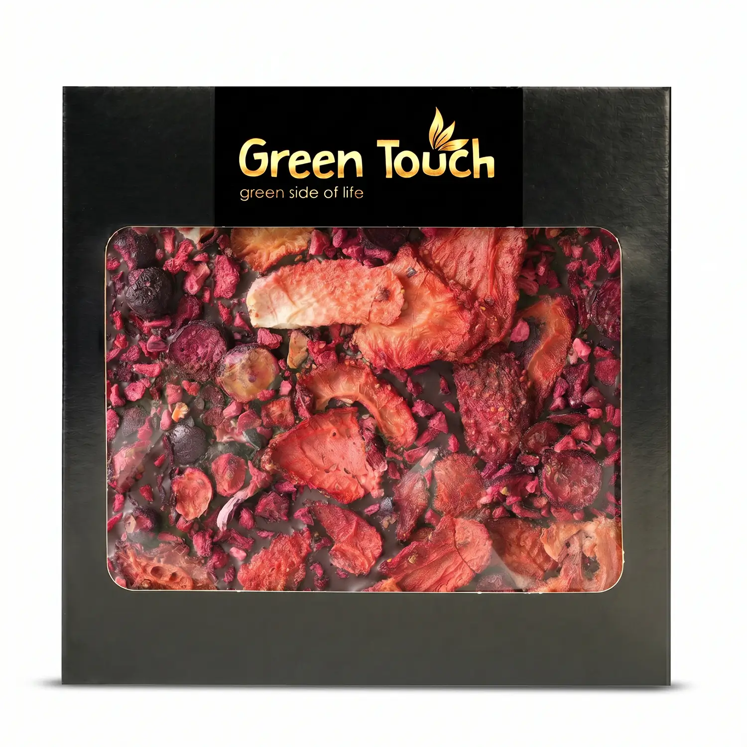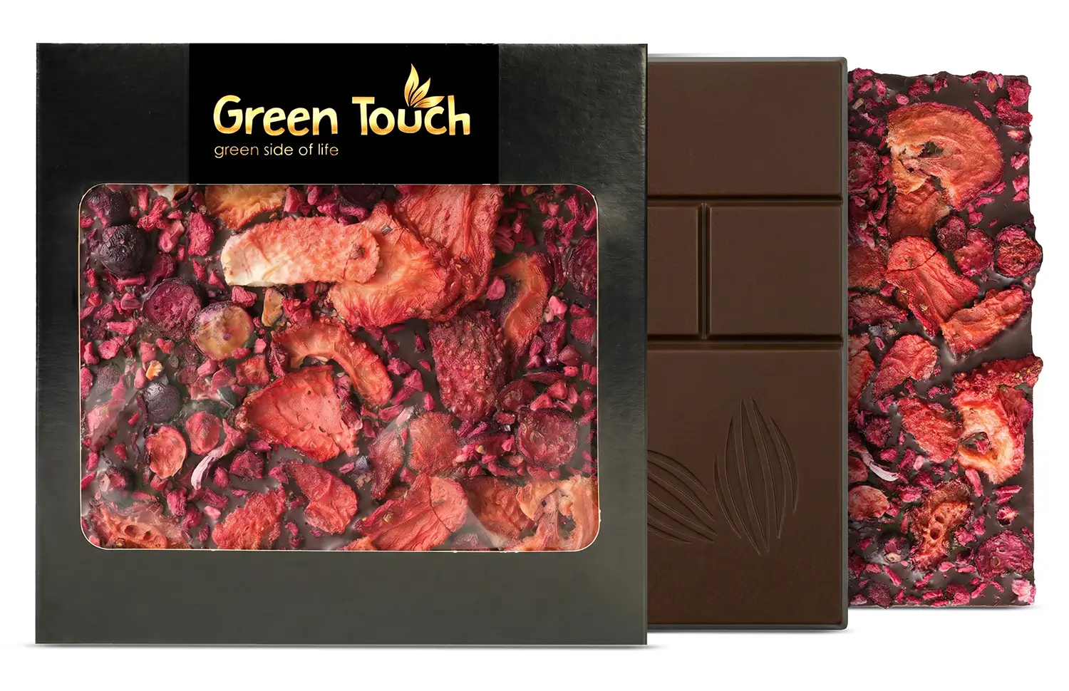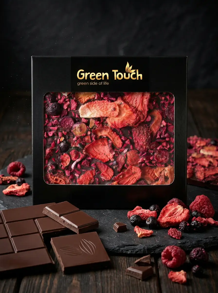 Green Touch to marka, która łączy dopracowaną estetykę z ciekawymi i nowoczesnymi kompozycjami smakowymi. W tej tabliczce klasyczna ciemna czekolada 70% kakao została połączona z owocami liofilizowanymi, dzięki czemu całość zyskuje bardziej świeży, lekko kwaskowy i bardzo przyjemny charakter.