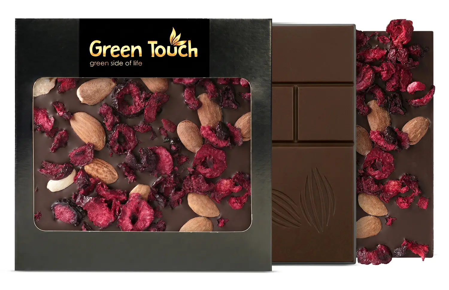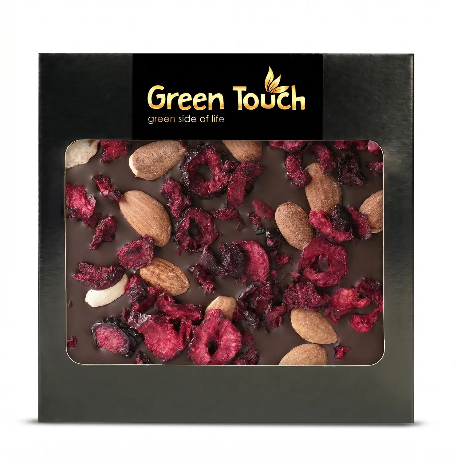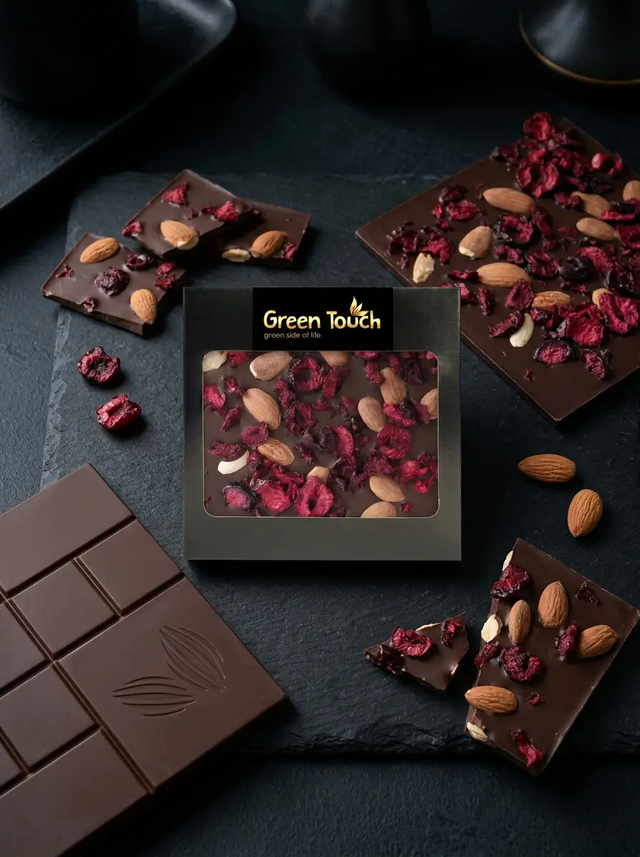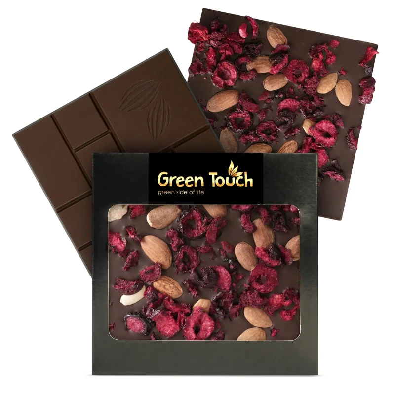 Green Touch to marka, która łączy atrakcyjny wygląd produktu z dopracowanymi kompozycjami smakowymi. W tej tabliczce intensywna ciemna czekolada 72% została połączona z dodatkiem migdałów i liofilizowanej wiśni, dzięki czemu całość ma głęboki, lekko owocowy i przyjemnie chrupiący charakter.