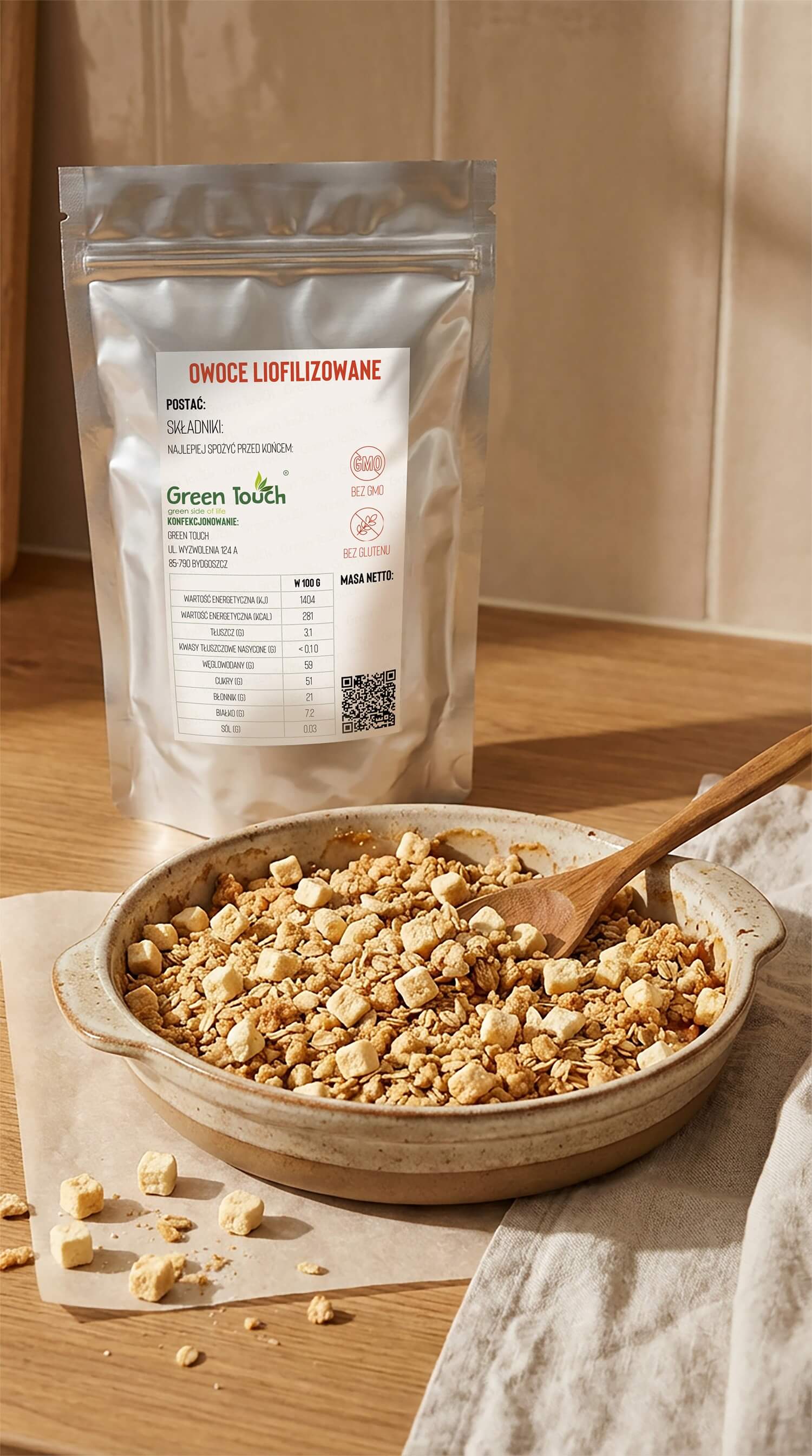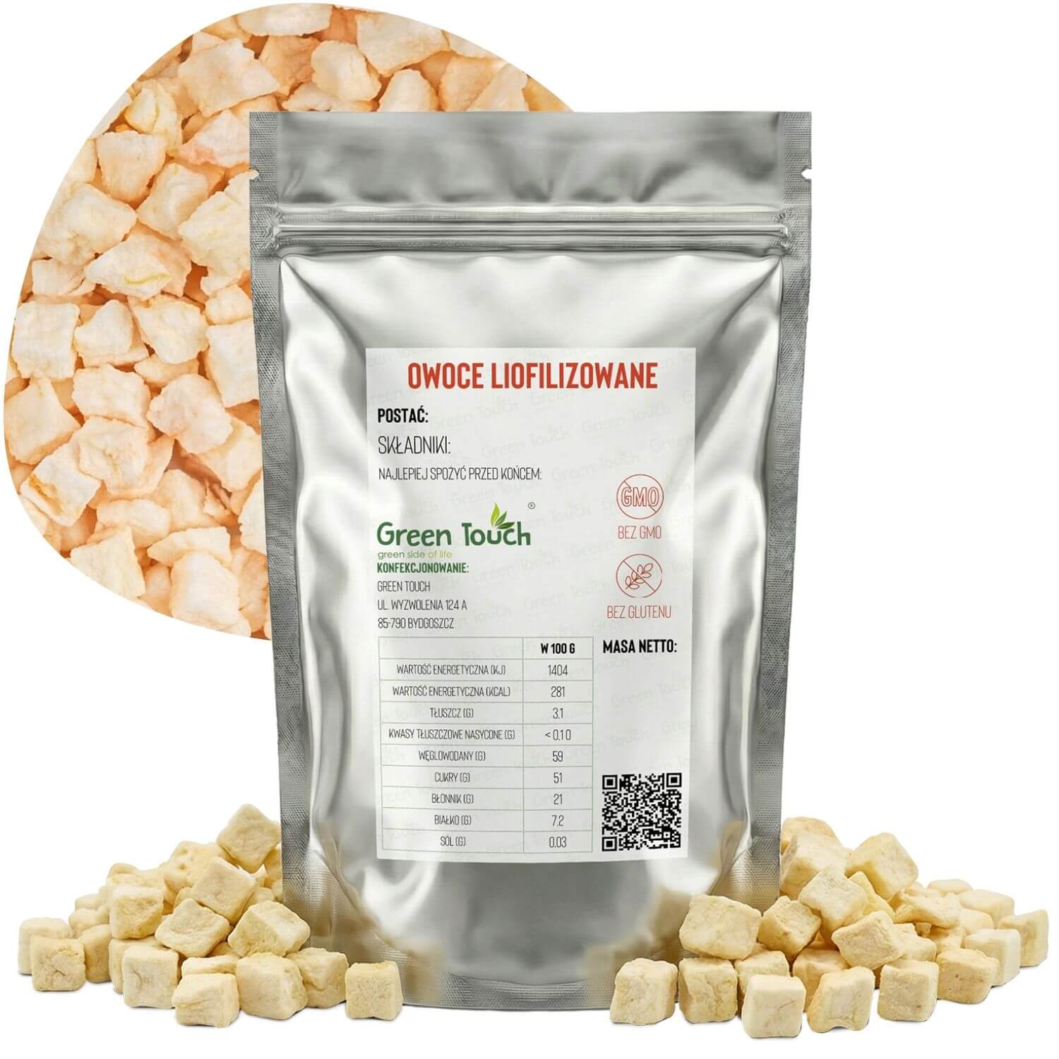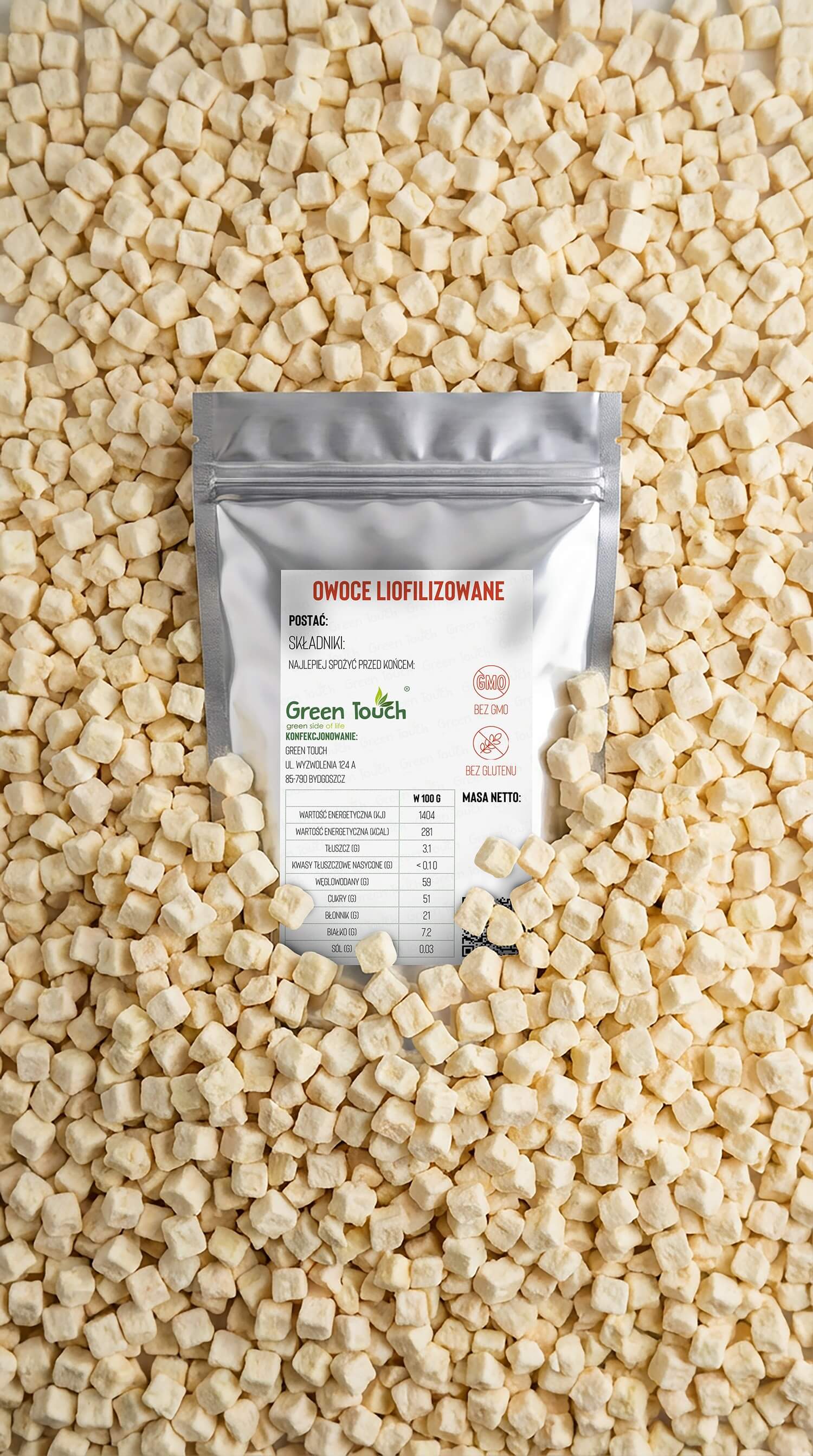 Jabłka liofilizowane pakujemy w metalizowaną torebkę typu doypack, hermetycznie zgrzewaną, z praktycznym zamknięciem strunowym. Takie opakowanie chroni produkt przed wilgocią i utratą aromatu oraz umożliwia wielokrotne otwieranie i zamykanie bez pogorszenia jakości.