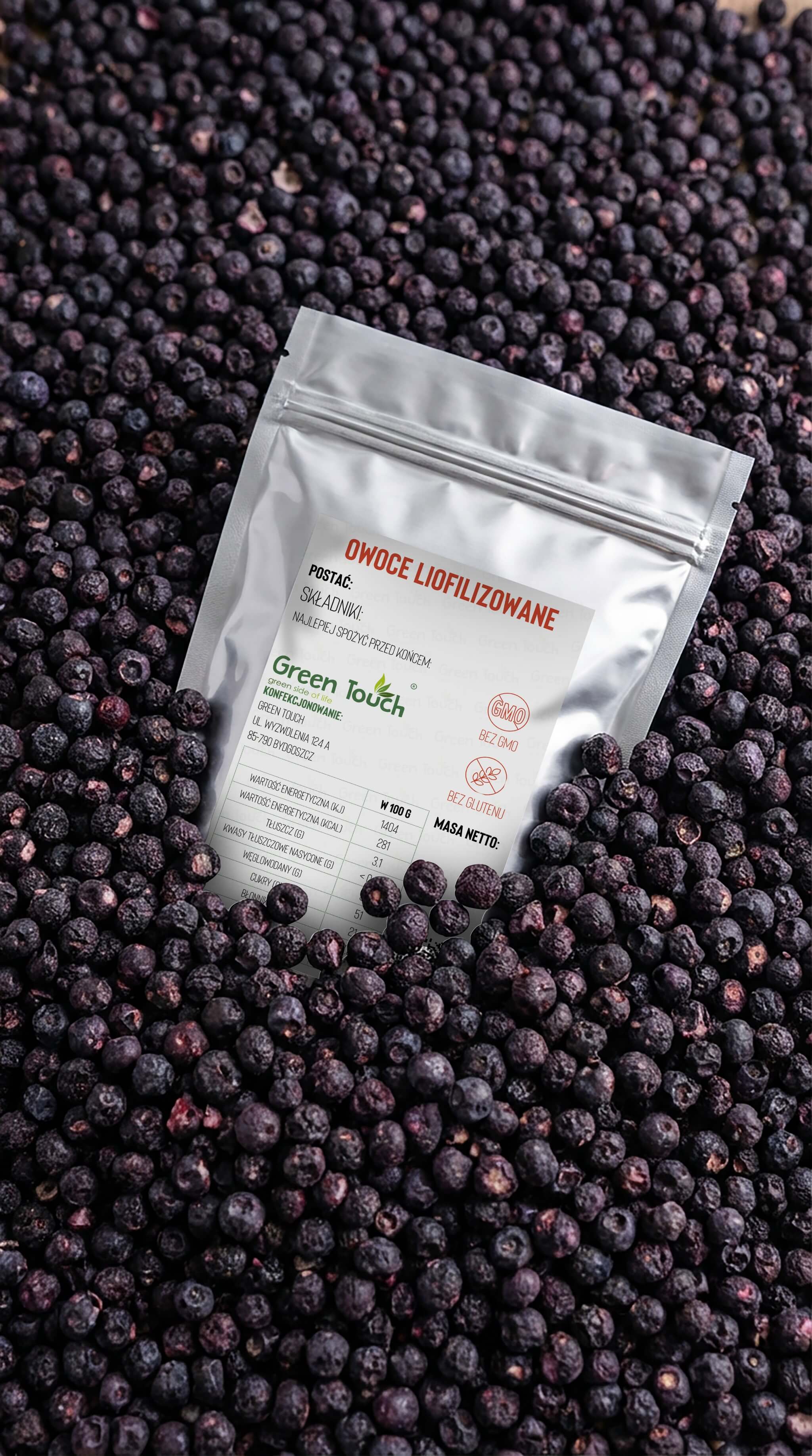 Jagody liofilizowane pakujemy w metalizowaną torebkę typu doypack, hermetycznie zgrzewaną, z praktycznym zamknięciem strunowym. Takie opakowanie chroni produkt przed wilgocią i utratą aromatu oraz umożliwia wielokrotne otwieranie i zamykanie bez pogorszenia jakości.