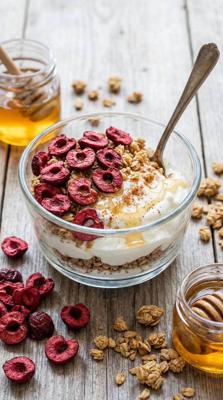 Jogurt grecki z wiśniami liofilizowanymi i granolą
