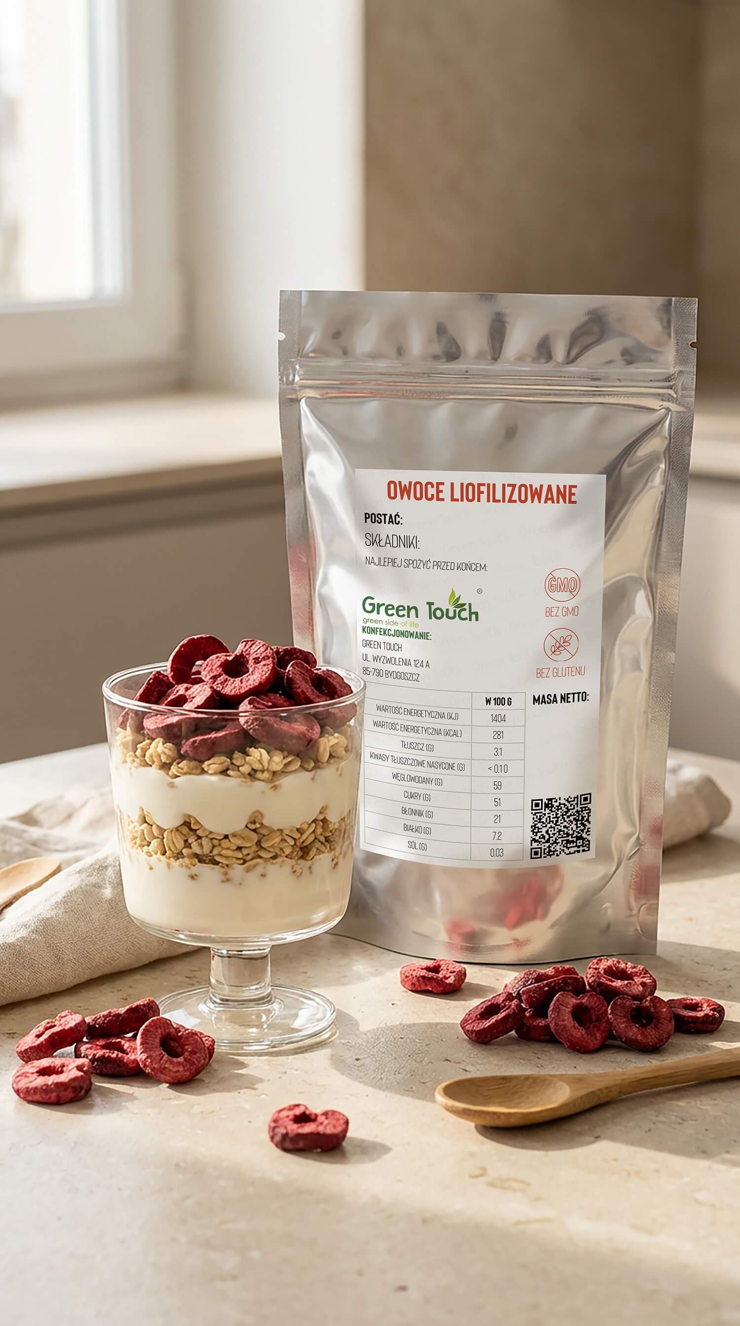 Wiśnie liofilizowane pakujemy w metalizowaną torebkę typu doypack, hermetycznie zgrzewaną, z praktycznym zamknięciem strunowym. Takie opakowanie chroni produkt przed wilgocią i utratą aromatu oraz umożliwia wielokrotne otwieranie i zamykanie bez pogorszenia jakości.
