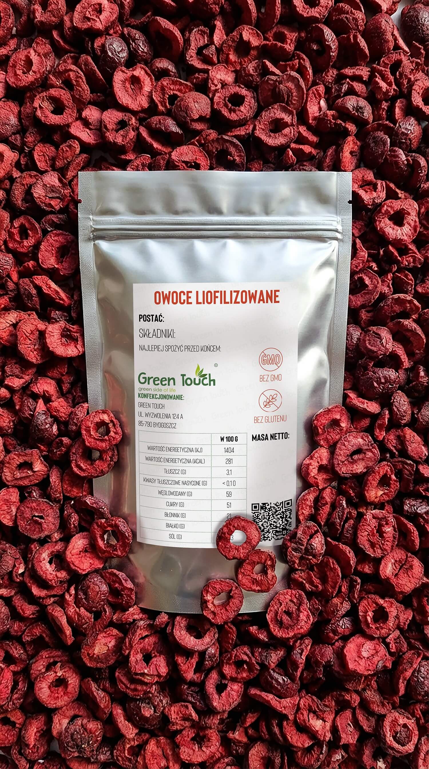 Liofilizacja to proces suszenia owoców w niskiej temperaturze, który pozwala zachować ich naturalne właściwości, smak oraz wartości odżywcze. Dzięki temu wiśnie pozostają lekkie, kruche i chrupkie, a jednocześnie trwałe i wygodne w przechowywaniu, bez konieczności stosowania konserwantów.