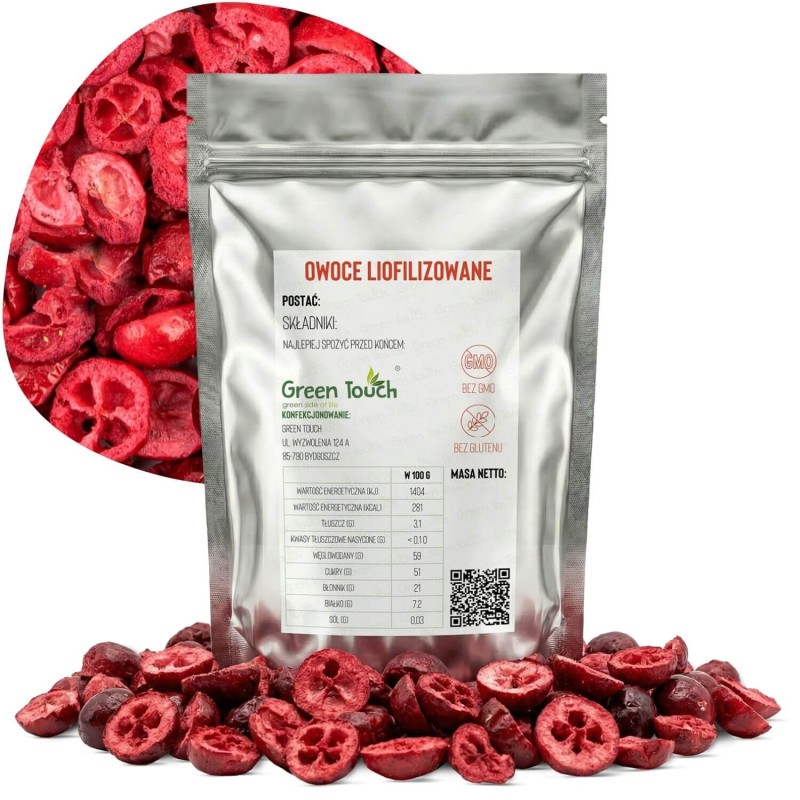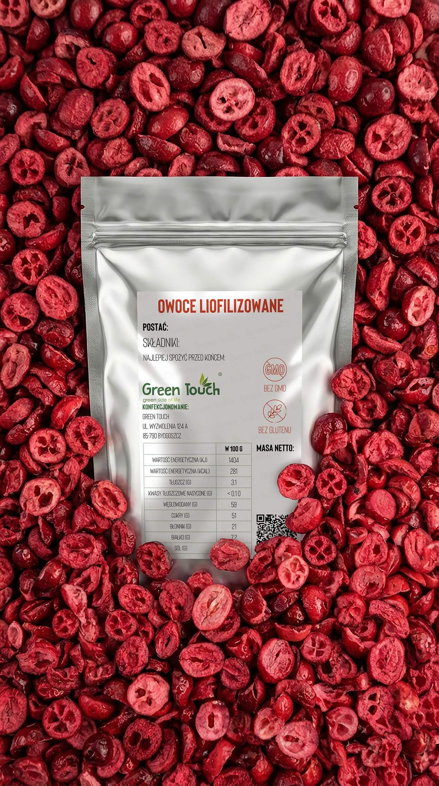 Liofilizacja to proces suszenia owoców w niskiej temperaturze, który pozwala zachować ich naturalne właściwości, smak oraz wartości odżywcze. Dzięki temu żurawiny pozostają lekkie, kruche i chrupkie, a jednocześnie trwałe i wygodne w przechowywaniu, bez konieczności stosowania konserwantów.