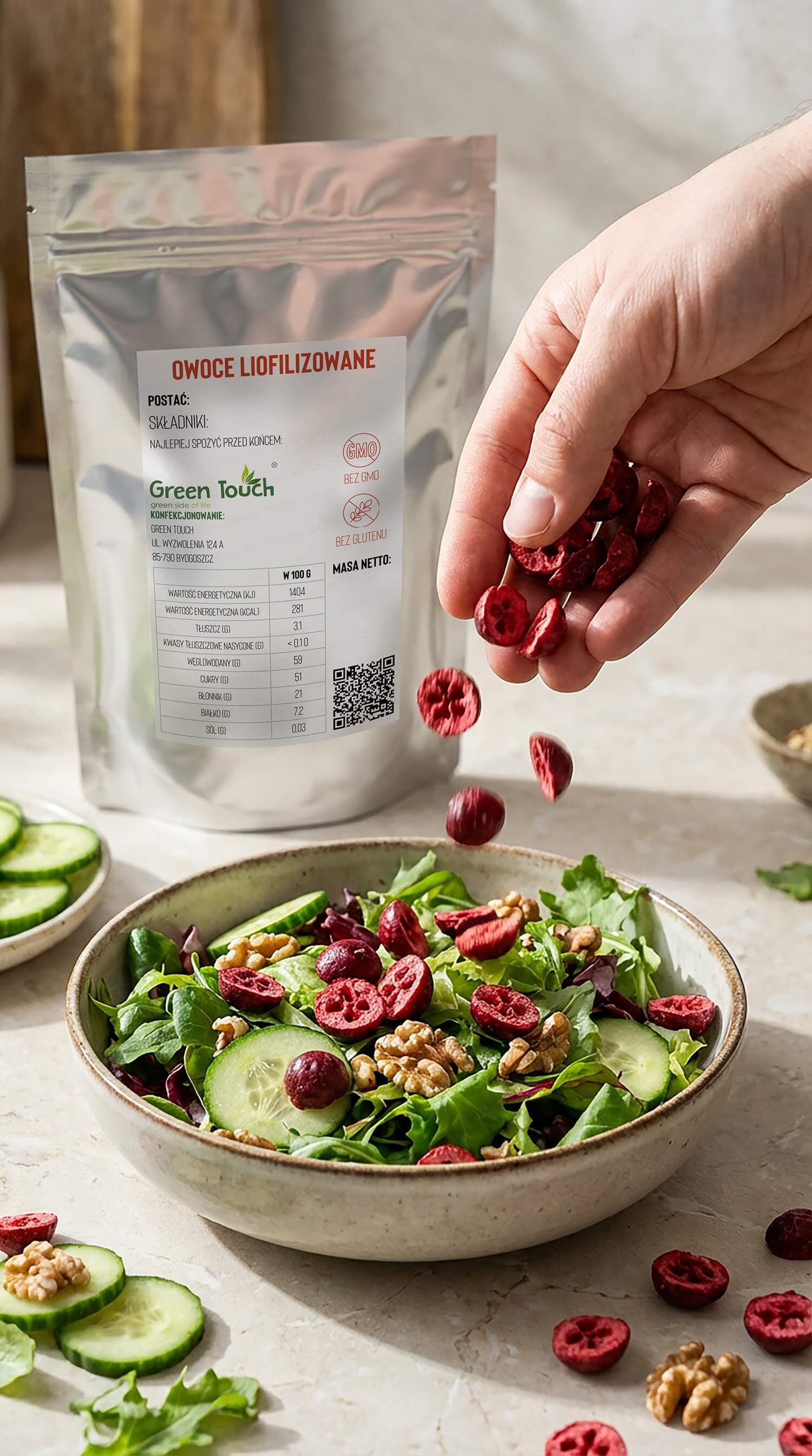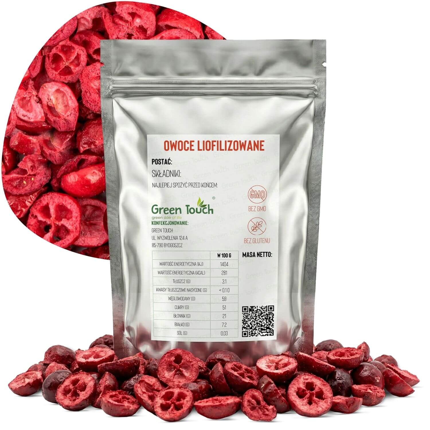 Połówki liofilizowanej żurawiny Green Touch to idealny sposób na dodanie potrawom kontrastu smakowego i koloru. Świetnie sprawdzają się zarówno w daniach wytrawnych, jak i w deserach, nadając im charakteru.
