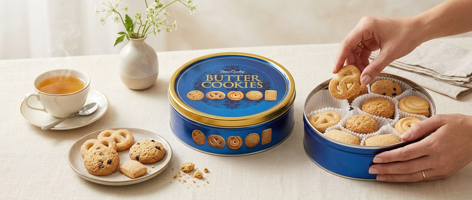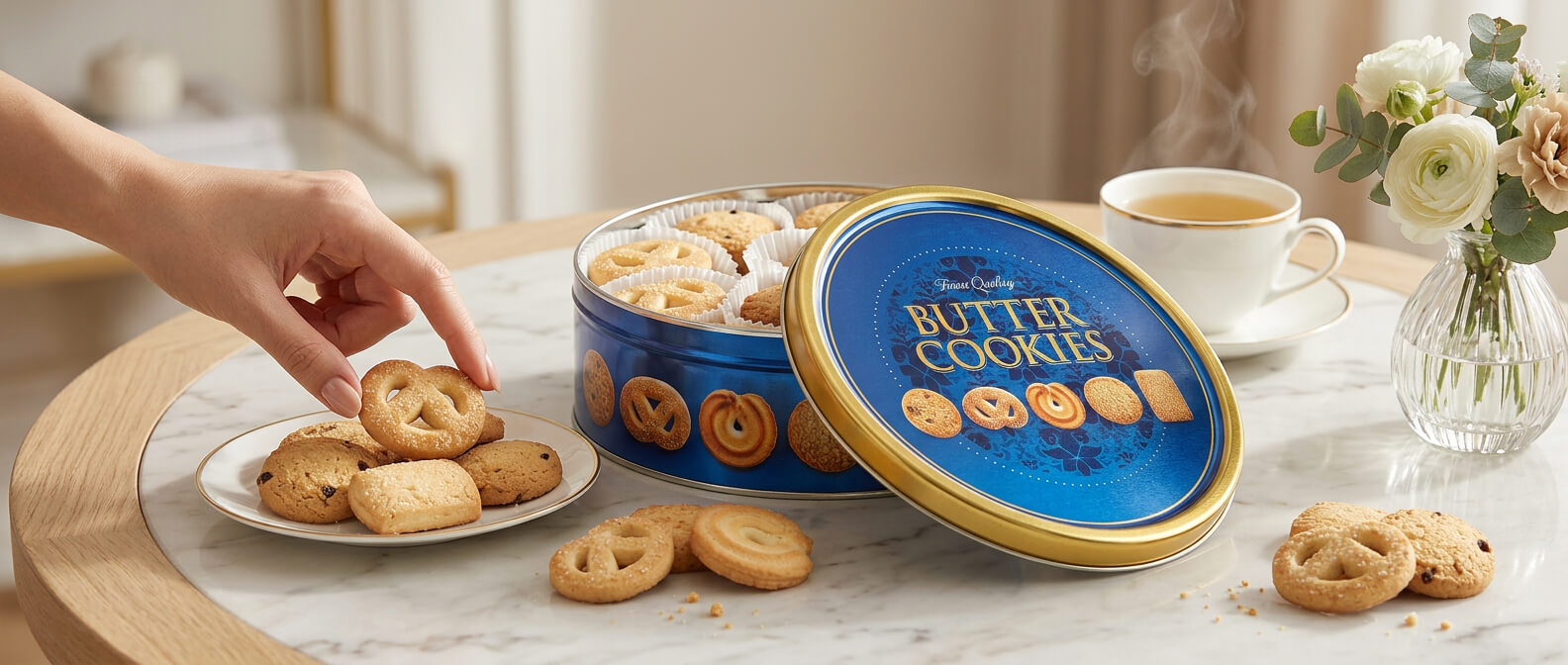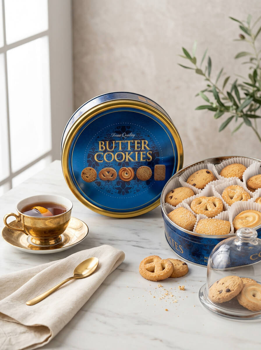 - Jeśli chcesz uzyskać bardziej prezentowy efekt, ustaw zamkniętą puszkę obok talerza z częścią ciastek - dzięki temu całość od razu wygląda jak gotowy słodki upominek.