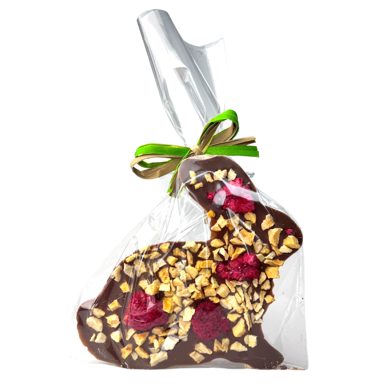 Zając z czekolady mlecznej z malinami i brzoskwinią, owoce liofilizowane 50 g
