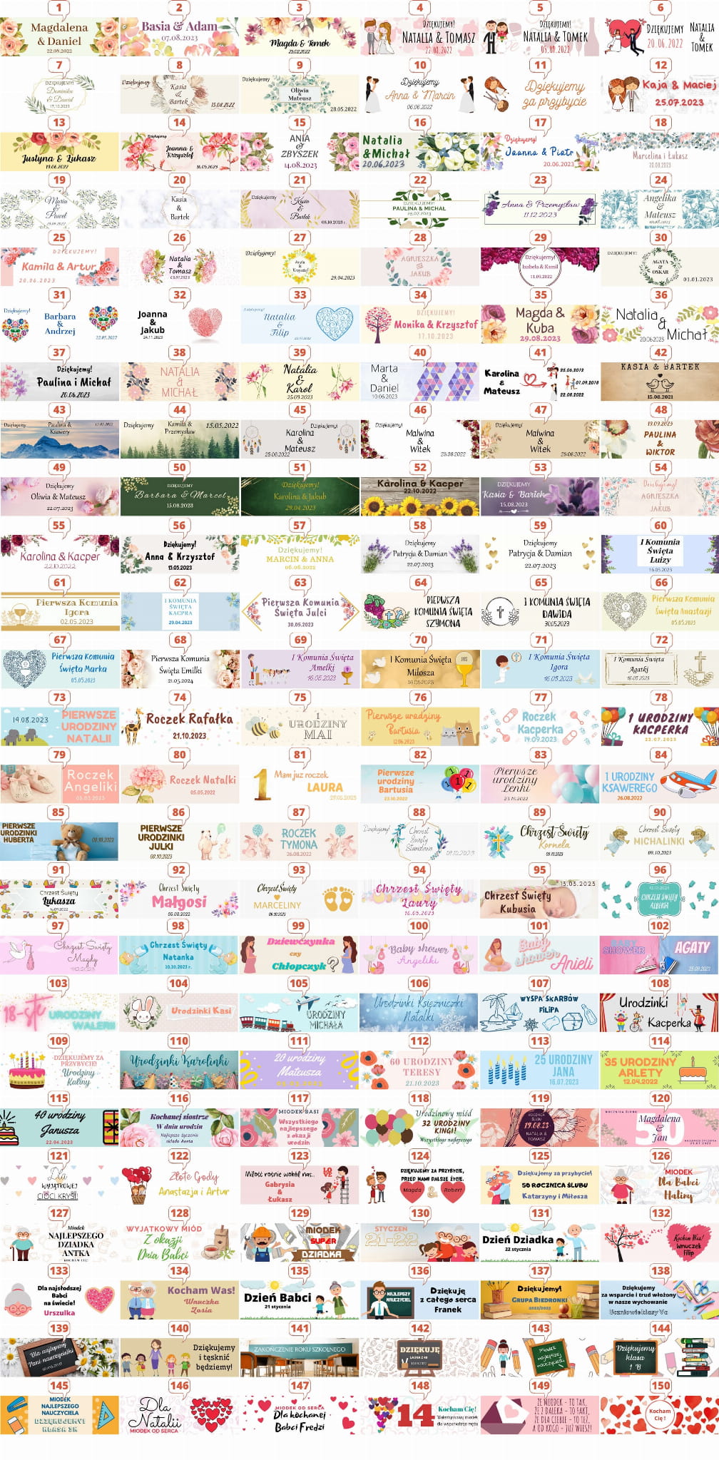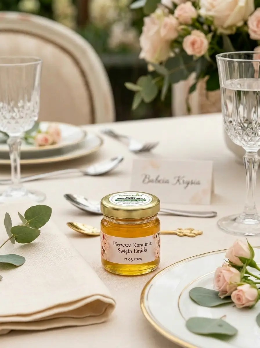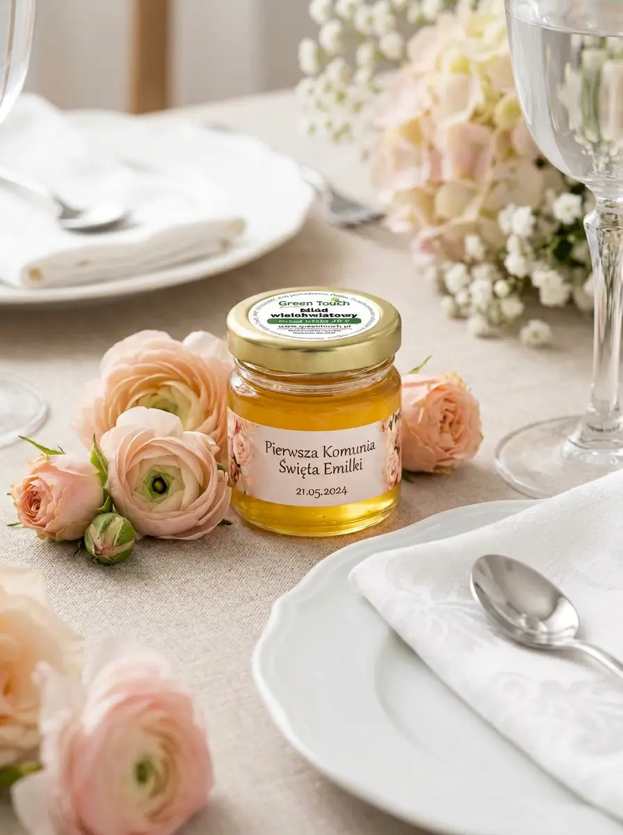 Słoiczki z miodem można dopasować do różnych stylów uroczystości - od klasycznych i delikatnych, po bardziej nowoczesne lub dekoracyjne. Dostępne wzory pozwalają przygotować spójne podziękowania pasujące do aranżacji stołu i charakteru wydarzenia.