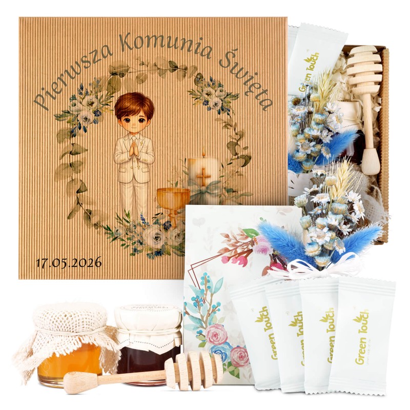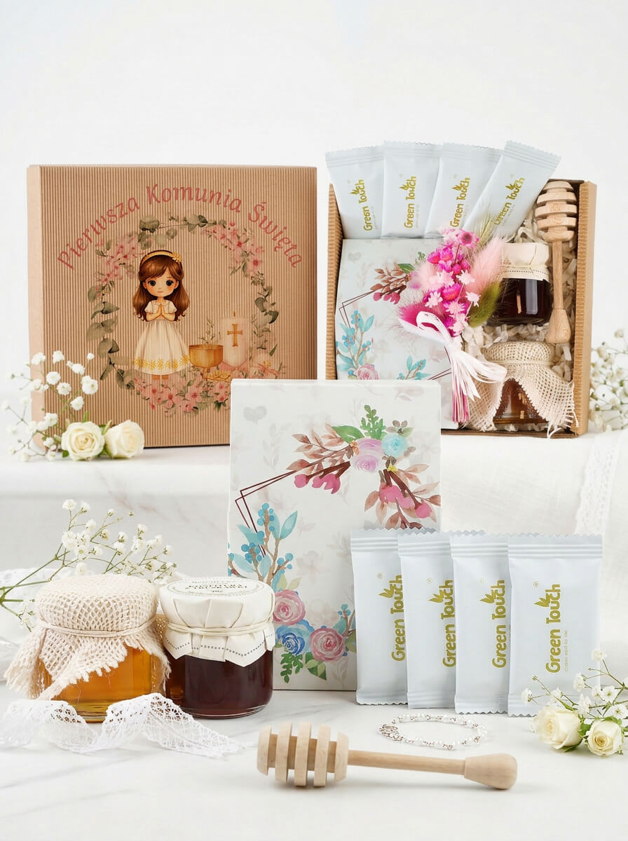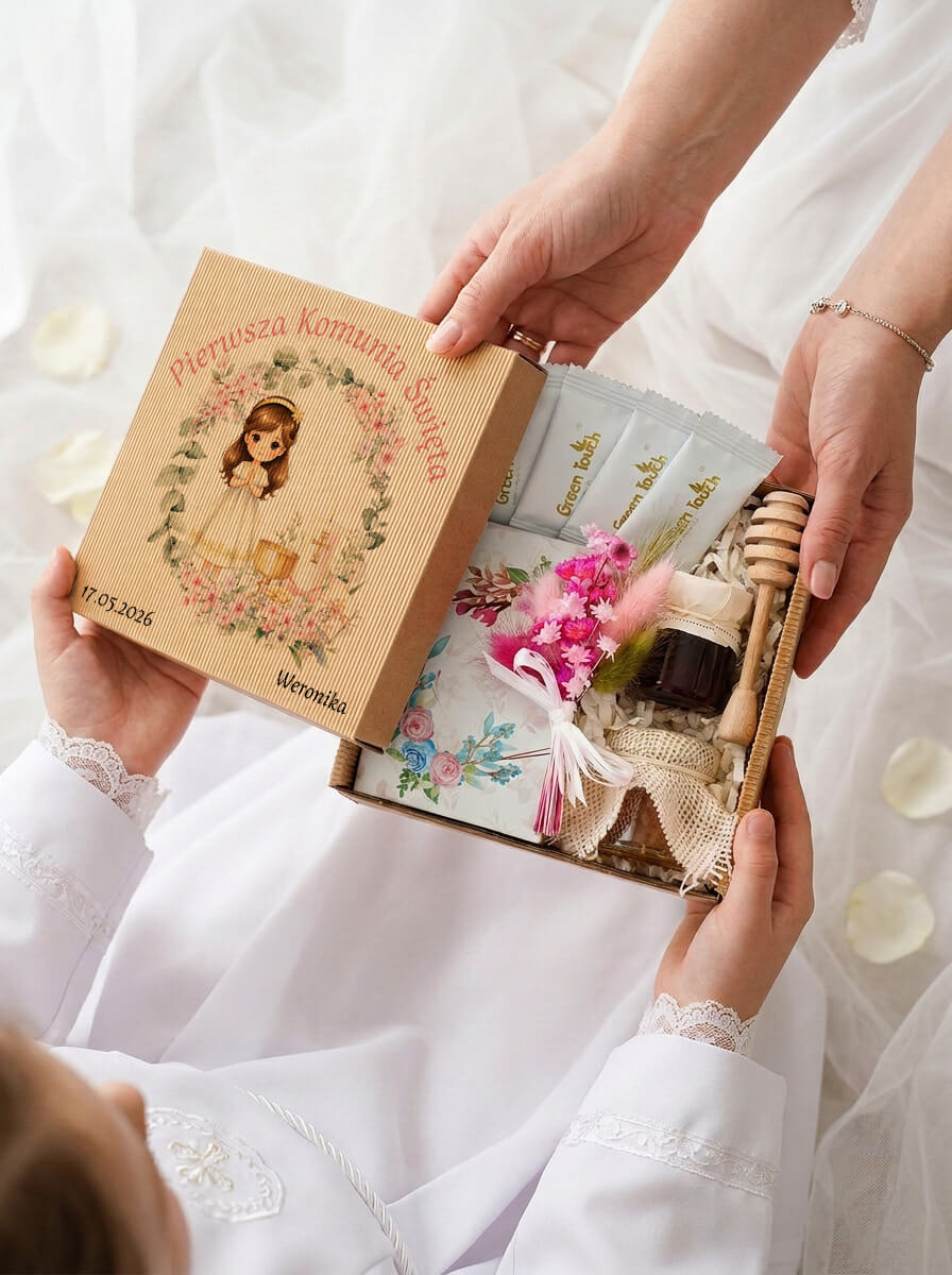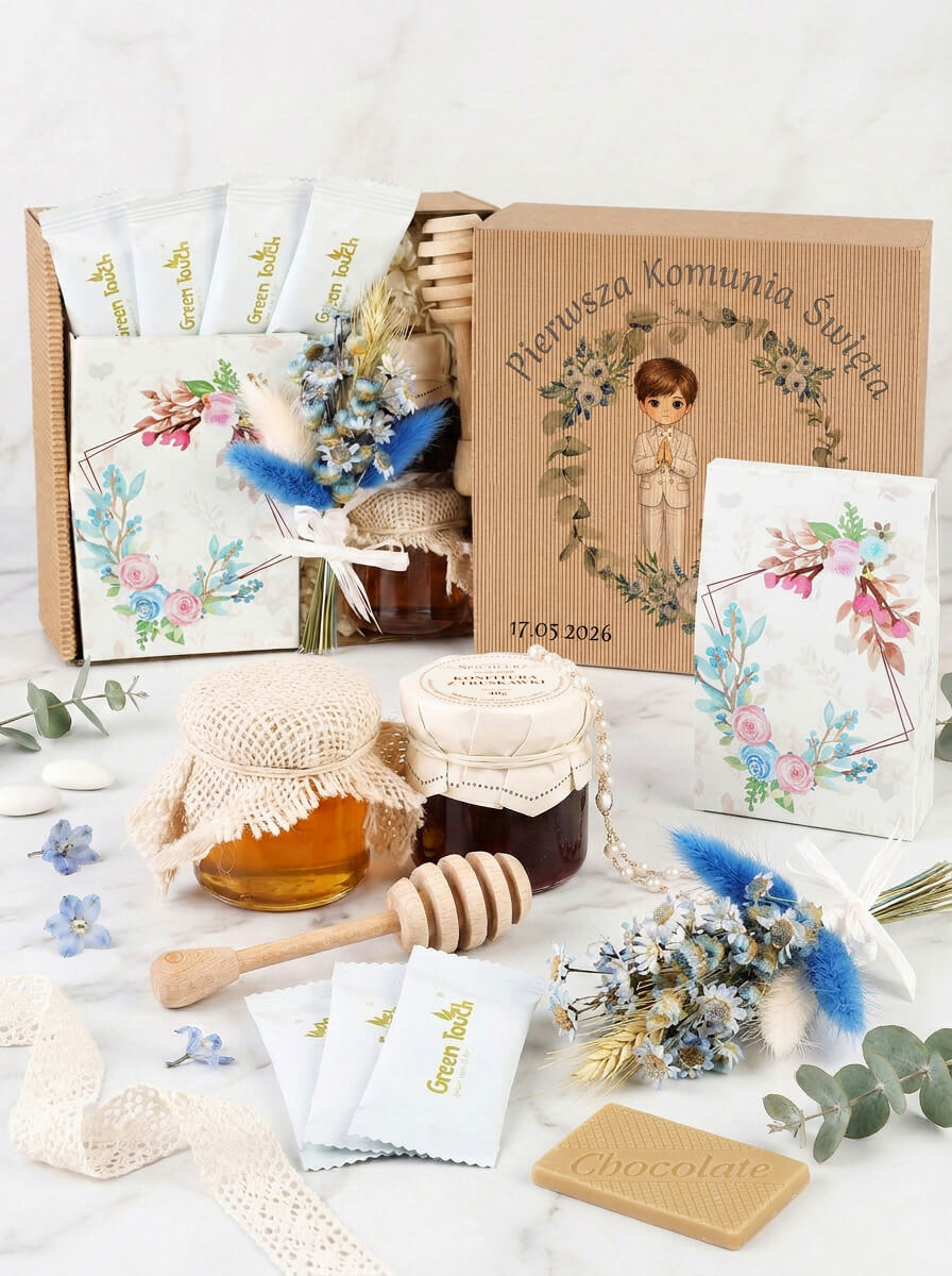 Ten zestaw wyróżnia się bardzo delikatną, elegancką formą. Dzięki niewielkiemu rozmiarowi wygląda lekko i stylowo, a jednocześnie zawiera wszystko, co potrzebne, by stworzyć gustowne podziękowanie. Całość utrzymana jest w jasnej, komunijnej estetyce - z kraftowym pudełkiem, ozdobnym nadrukiem, małymi słoiczkami, herbatą w saszetkach i dekoracyjnym bukiecikiem.
