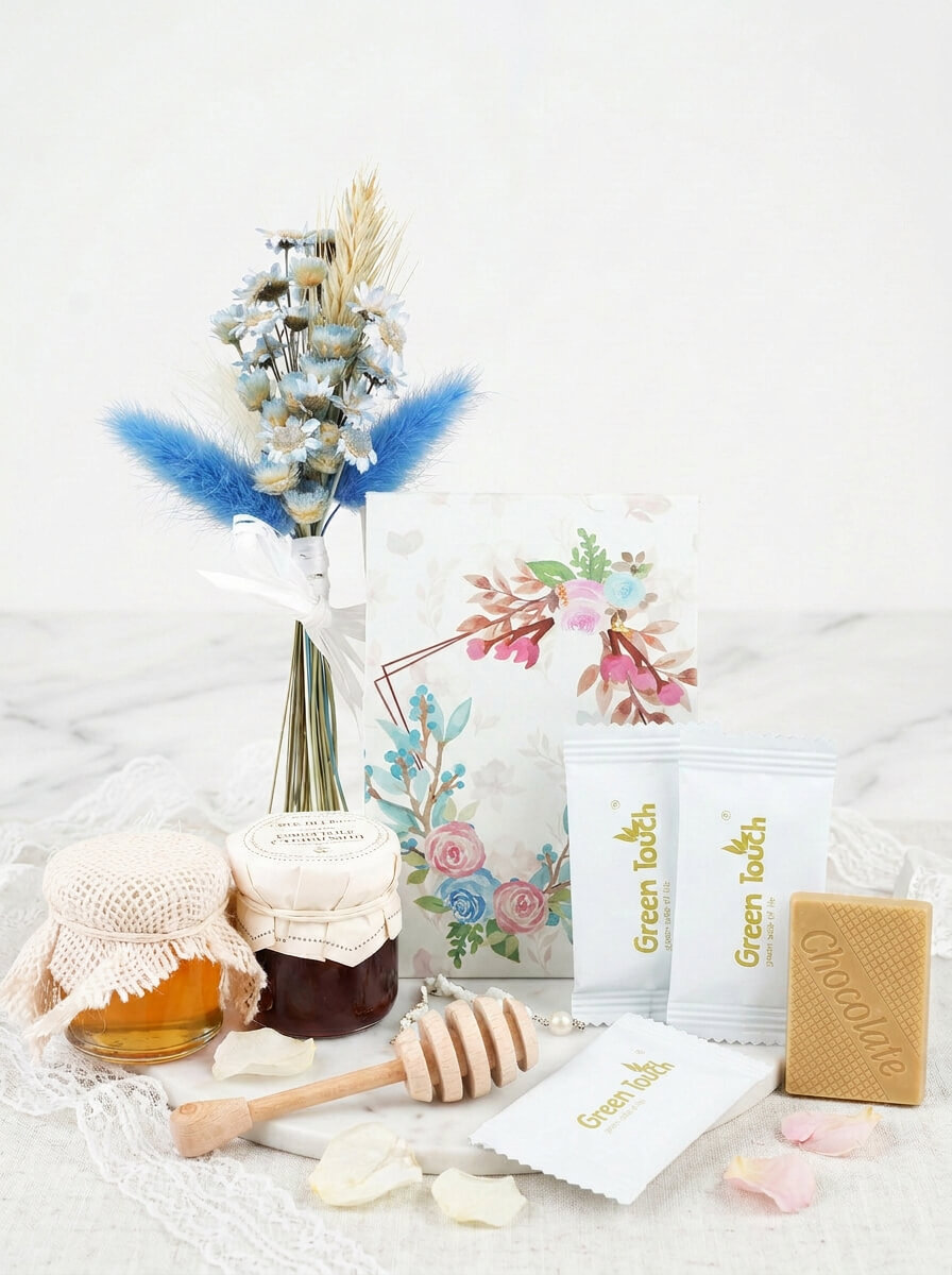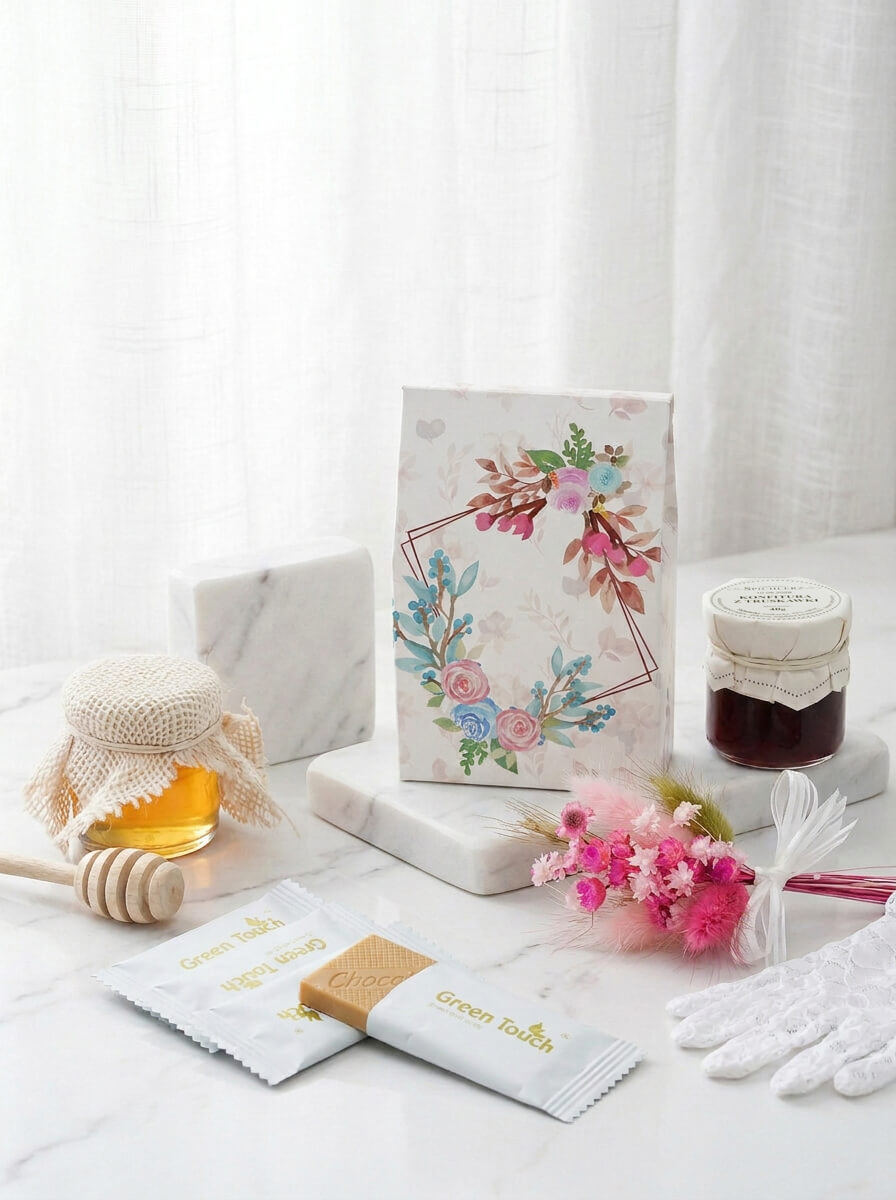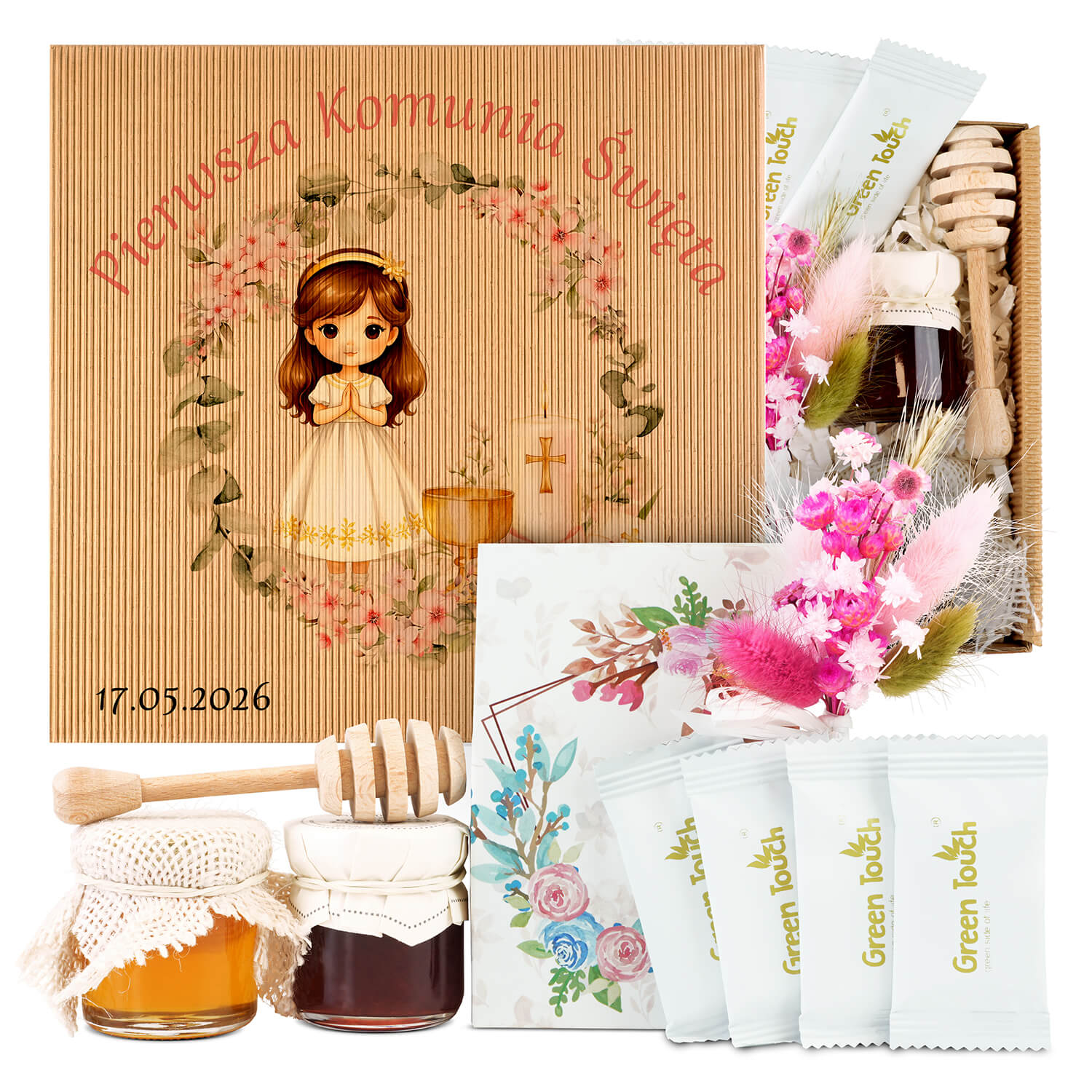 Ten zestaw wyróżnia się bardzo delikatną, elegancką formą. Dzięki niewielkiemu rozmiarowi wygląda lekko i stylowo, a jednocześnie zawiera wszystko, co potrzebne, by stworzyć gustowne podziękowanie. Całość utrzymana jest w jasnej, komunijnej estetyce - z kraftowym pudełkiem, ozdobnym nadrukiem, małymi słoiczkami, herbatą w saszetkach i dekoracyjnym bukiecikiem.