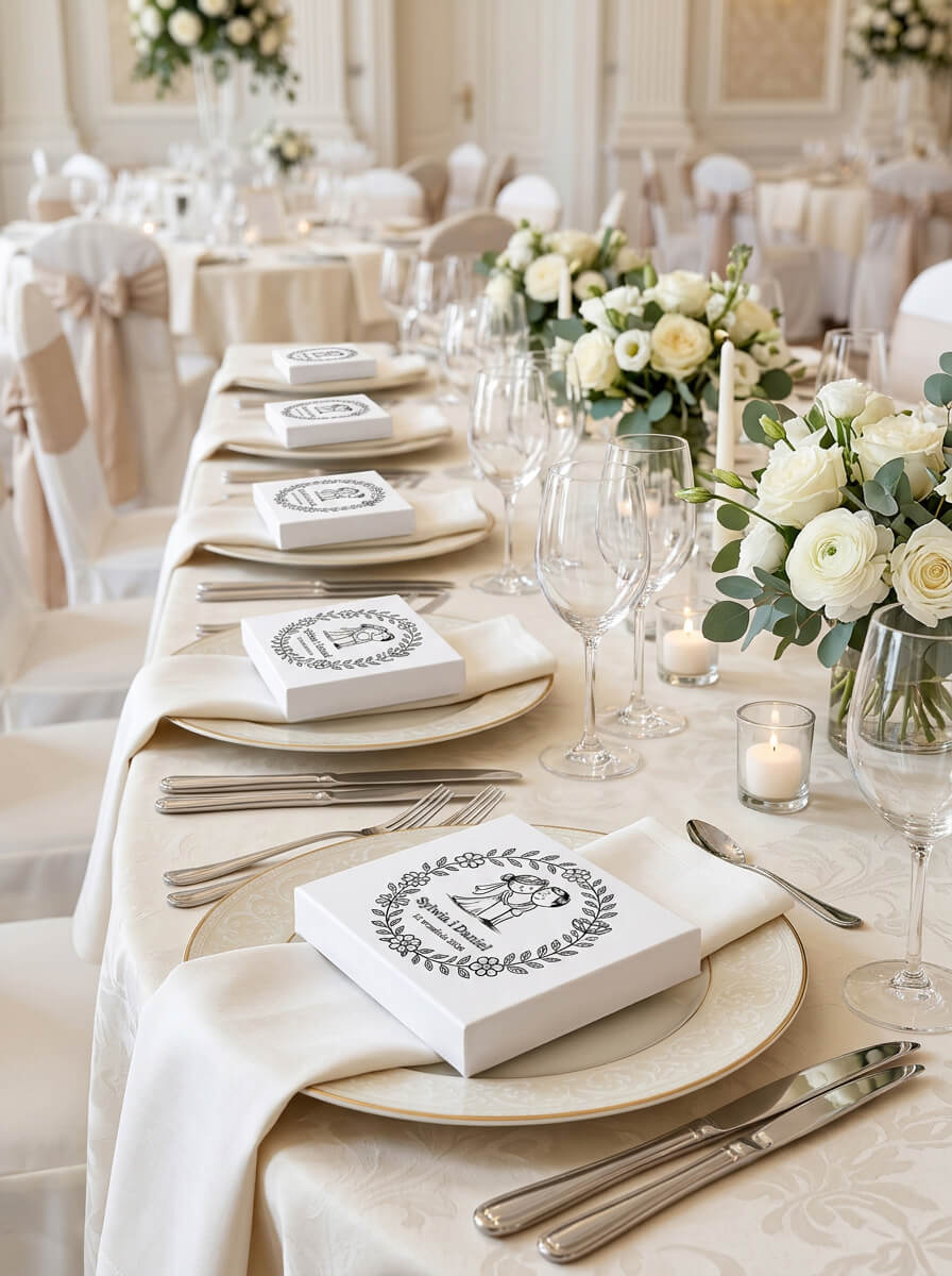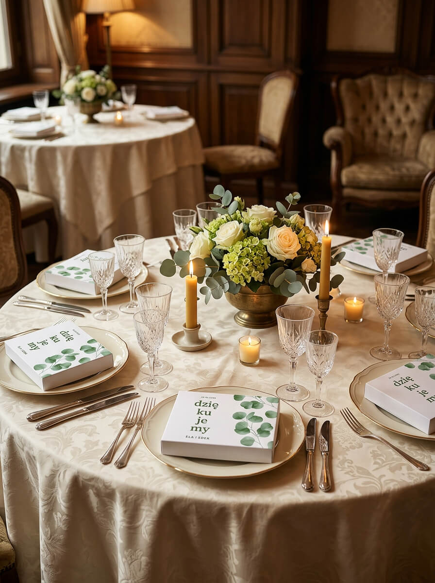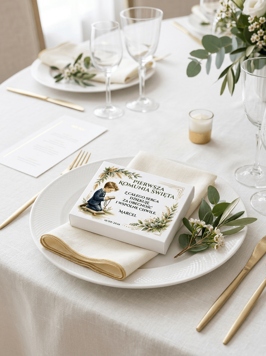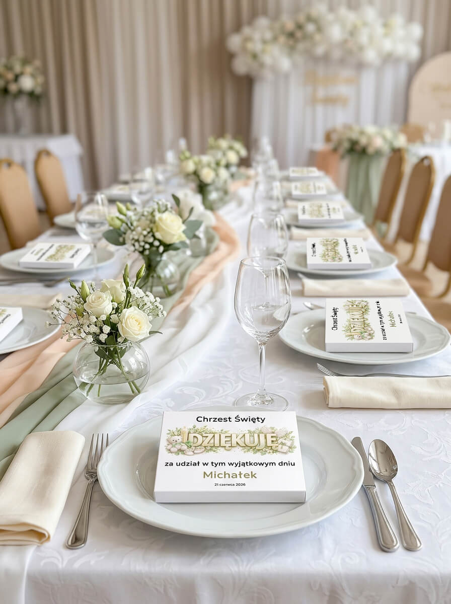 Dzięki temu zwykłe pudełko z upominkiem zmienia się w osobistą pamiątkę uroczystości, która pięknie wygląda na stole i zostaje z gośćmi na dłużej jako miłe wspomnienie.