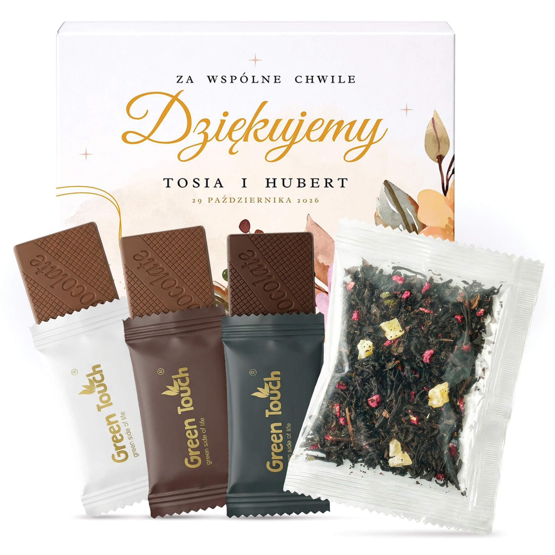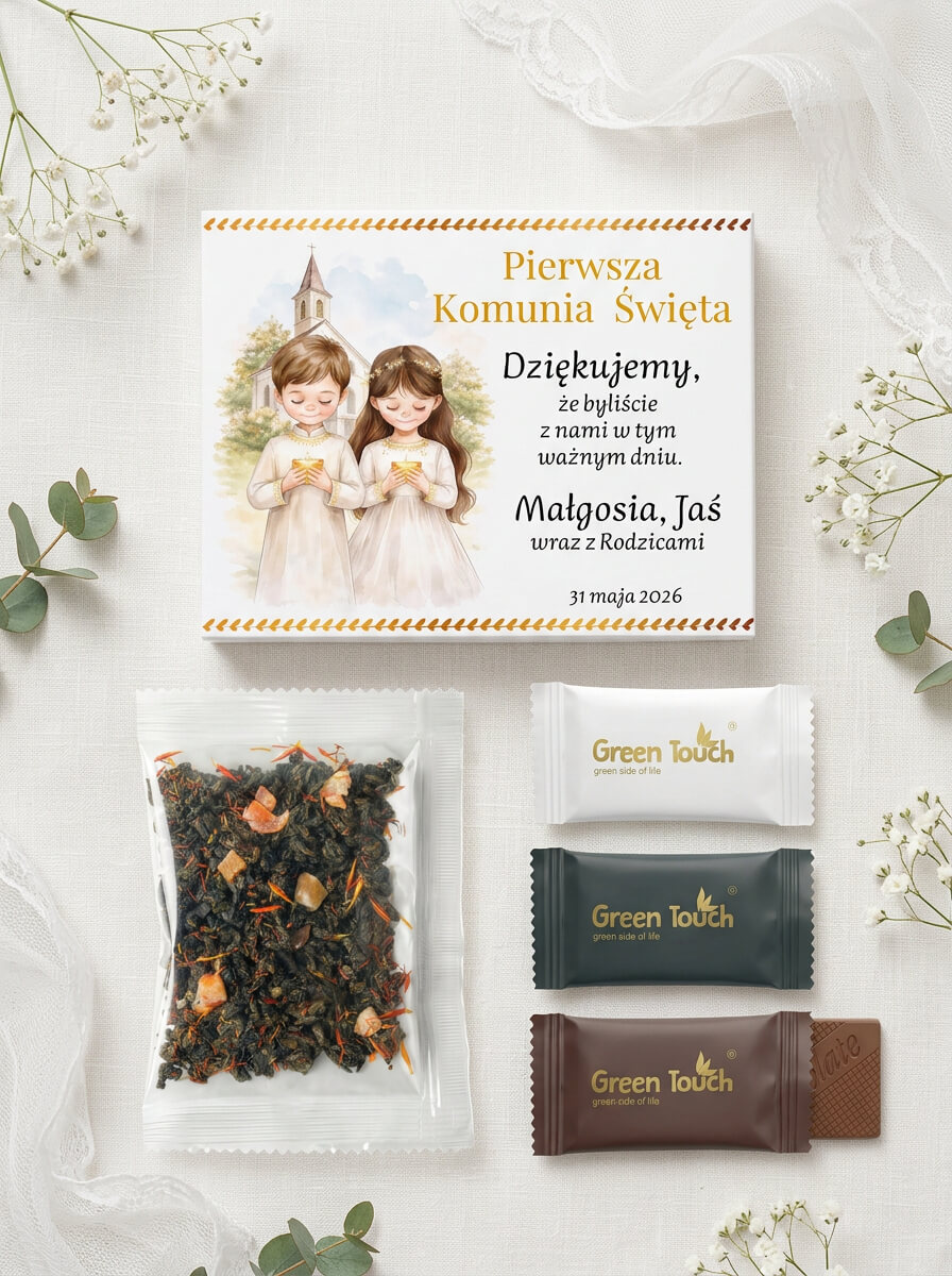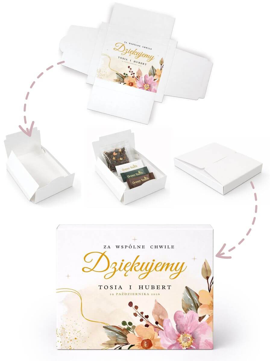 Szukasz eleganckiego podziękowania dla gości na ślub lub wesele? Personalizowane pudełko z nadrukiem, herbatą liściastą Green Touch z dodatkiem owoców i trzema czekoladkami to drobny, ale wyjątkowy upominek, który pięknie prezentuje się przy nakryciu i tworzy miłą pamiątkę tego wyjątkowego dnia.