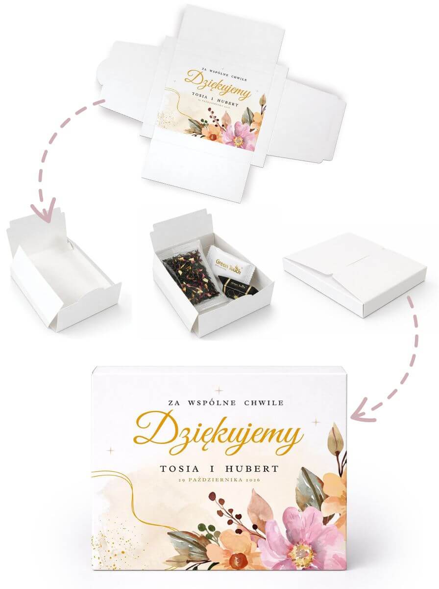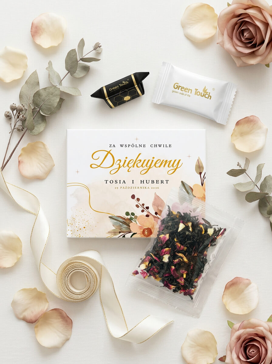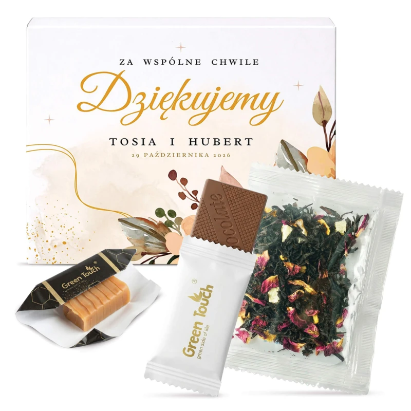 Szukasz eleganckiego podziękowania dla gości na ślub lub wesele? Personalizowane pudełko z nadrukiem, herbatą liściastą Green Touch, krówką miodową i czekoladką to drobny, ale wyjątkowy upominek, który pięknie prezentuje się przy nakryciu i tworzy miłą pamiątkę tego wyjątkowego dnia.