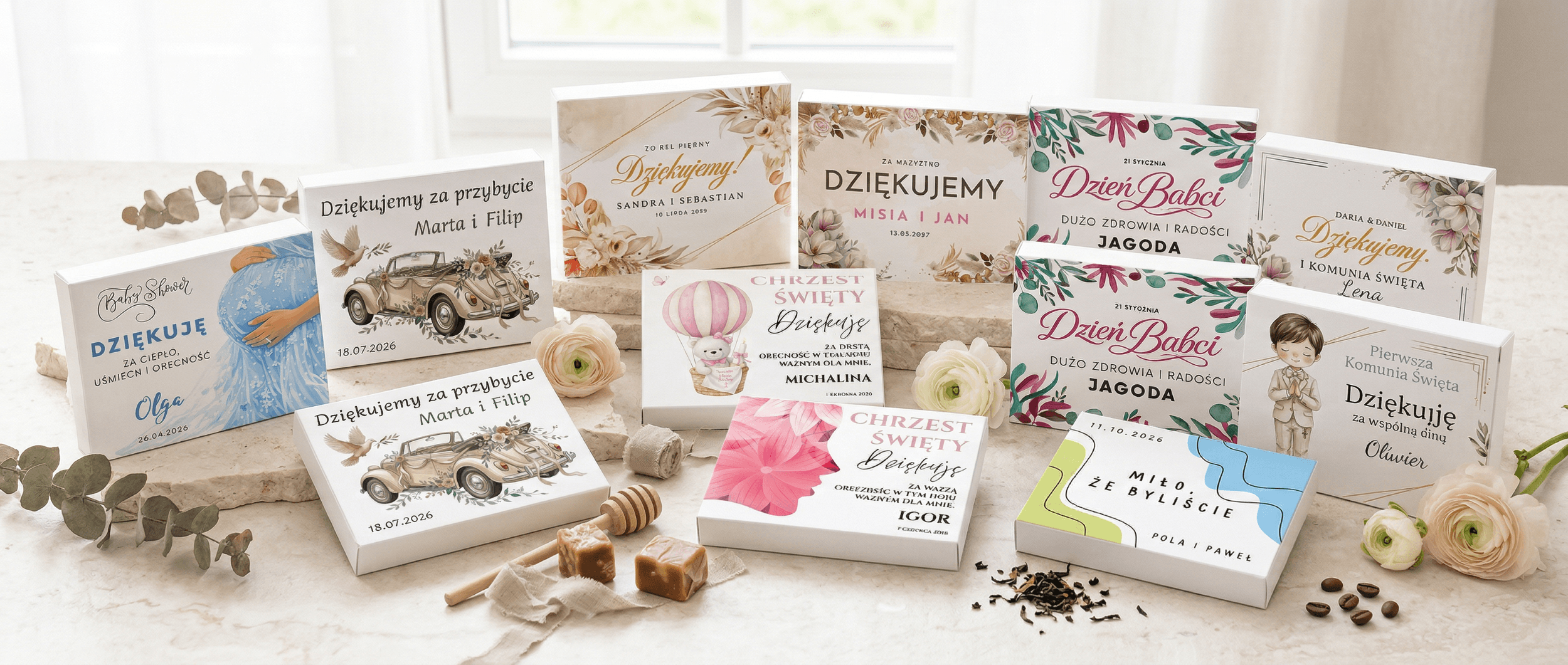 Dzięki temu zwykłe pudełko z upominkiem zmienia się w osobistą pamiątkę uroczystości, która pięknie wygląda na stole i zostaje z gośćmi na dłużej jako miłe wspomnienie.