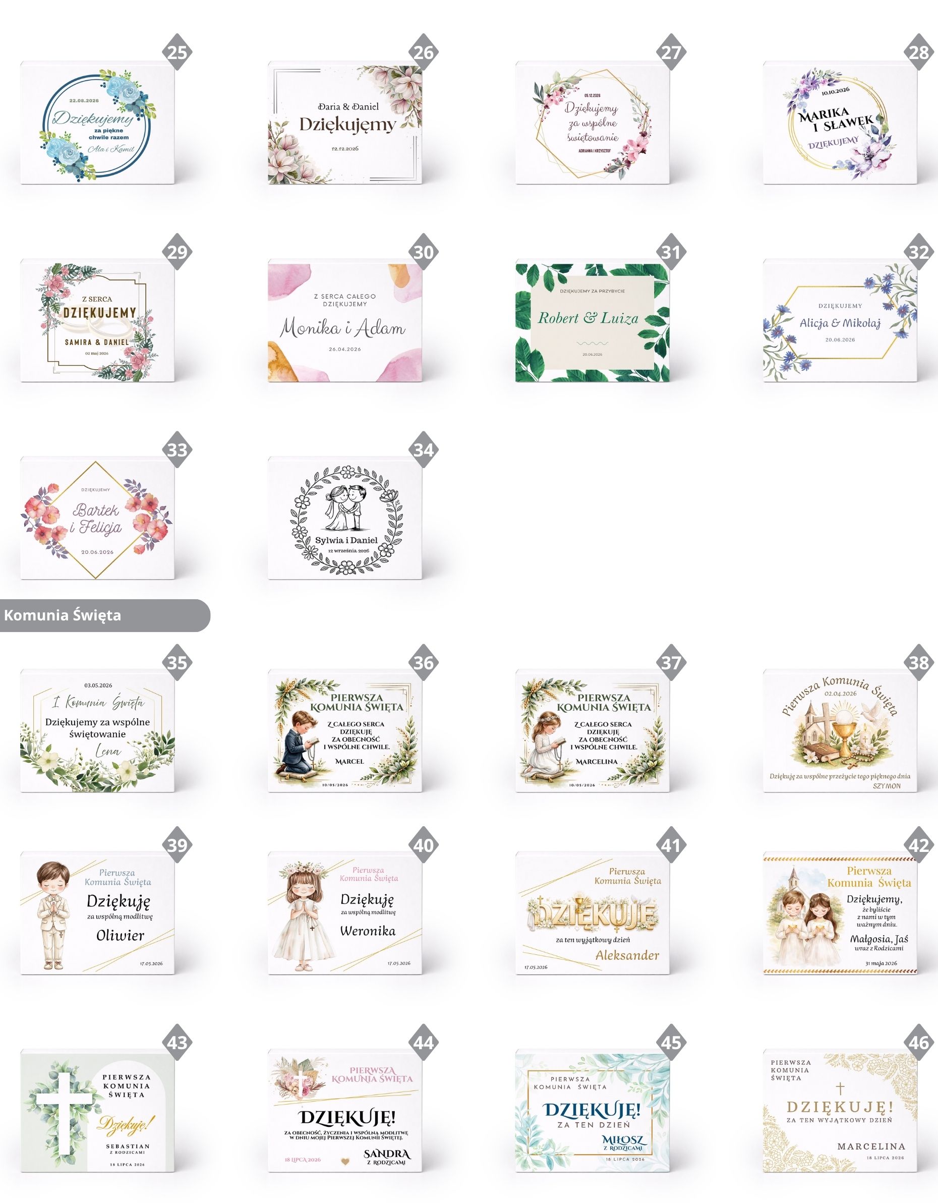 Podziękowanie dla gości upominek ślub wesele komunia chrzest zestaw herbata krówka czekolada w pudełku z nadrukiem