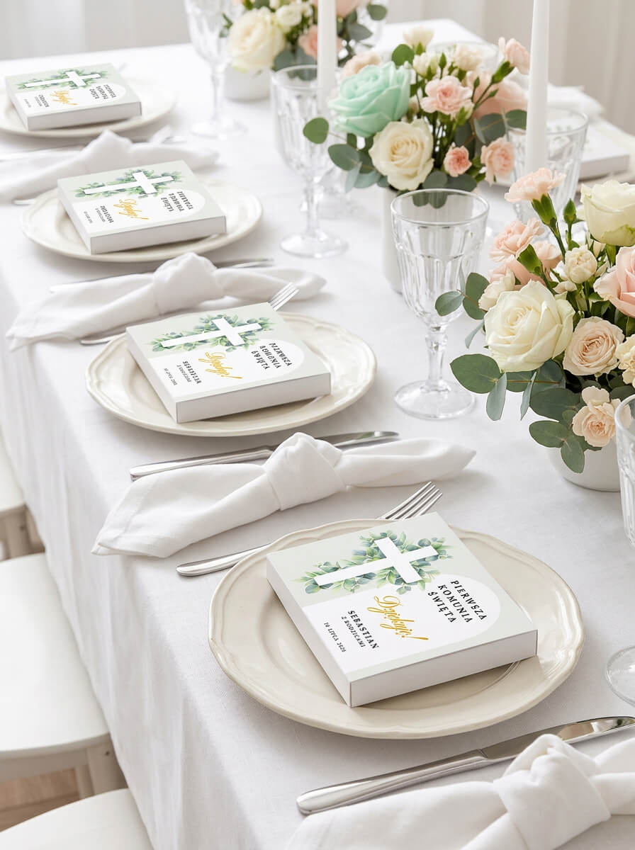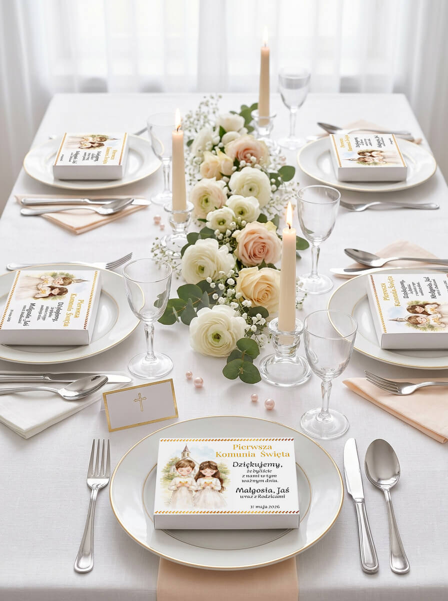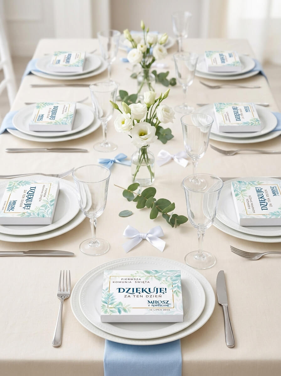 Dzięki temu zwykłe pudełko z upominkiem zmienia się w osobistą pamiątkę uroczystości, która pięknie wygląda na stole i zostaje z gośćmi na dłużej jako miłe wspomnienie.