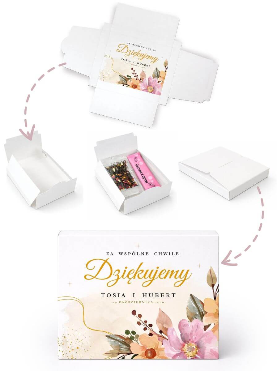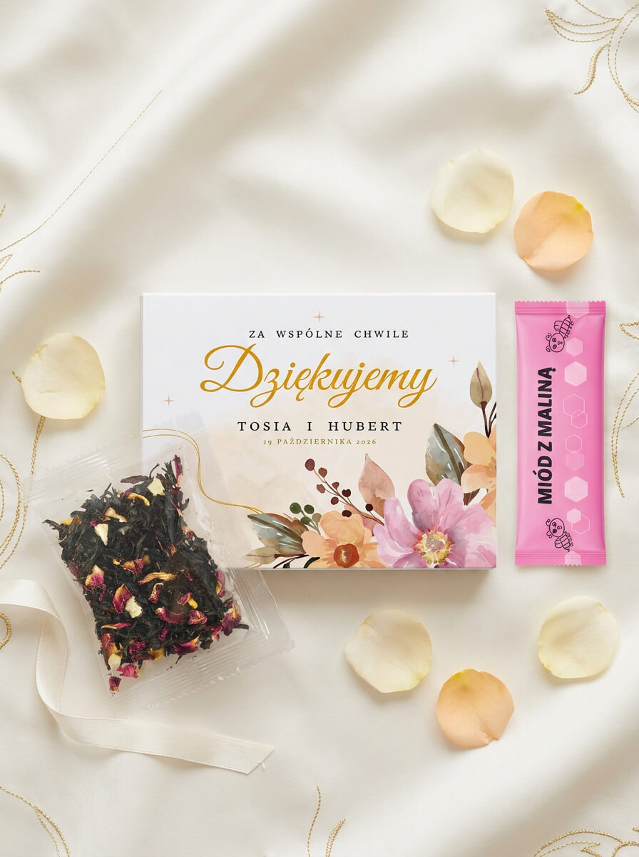 Szukasz eleganckiego podziękowania dla gości na ślub lub wesele? Personalizowane pudełko z nadrukiem, herbatą liściastą Green Touch i miodkiem malinowym to drobny, ale wyjątkowy upominek, który pięknie prezentuje się przy nakryciu i tworzy miłą pamiątkę tego wyjątkowego dnia.