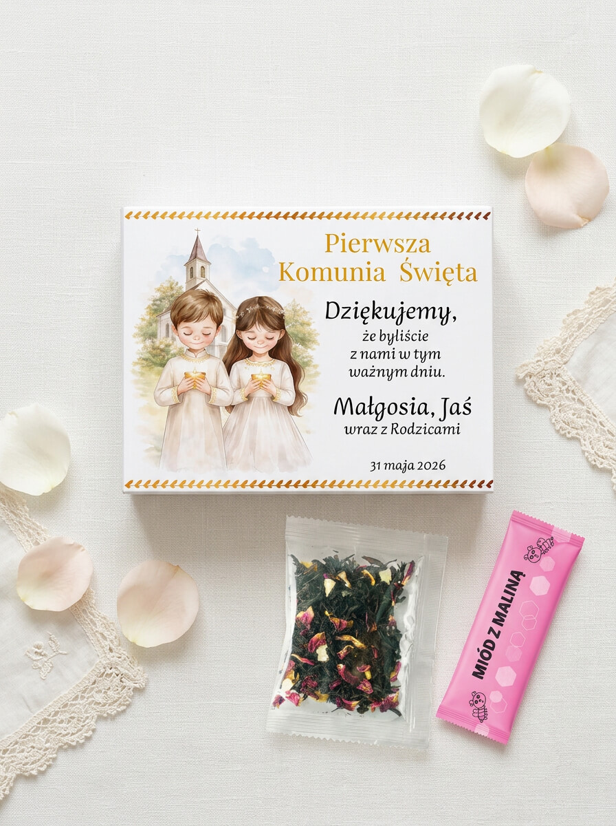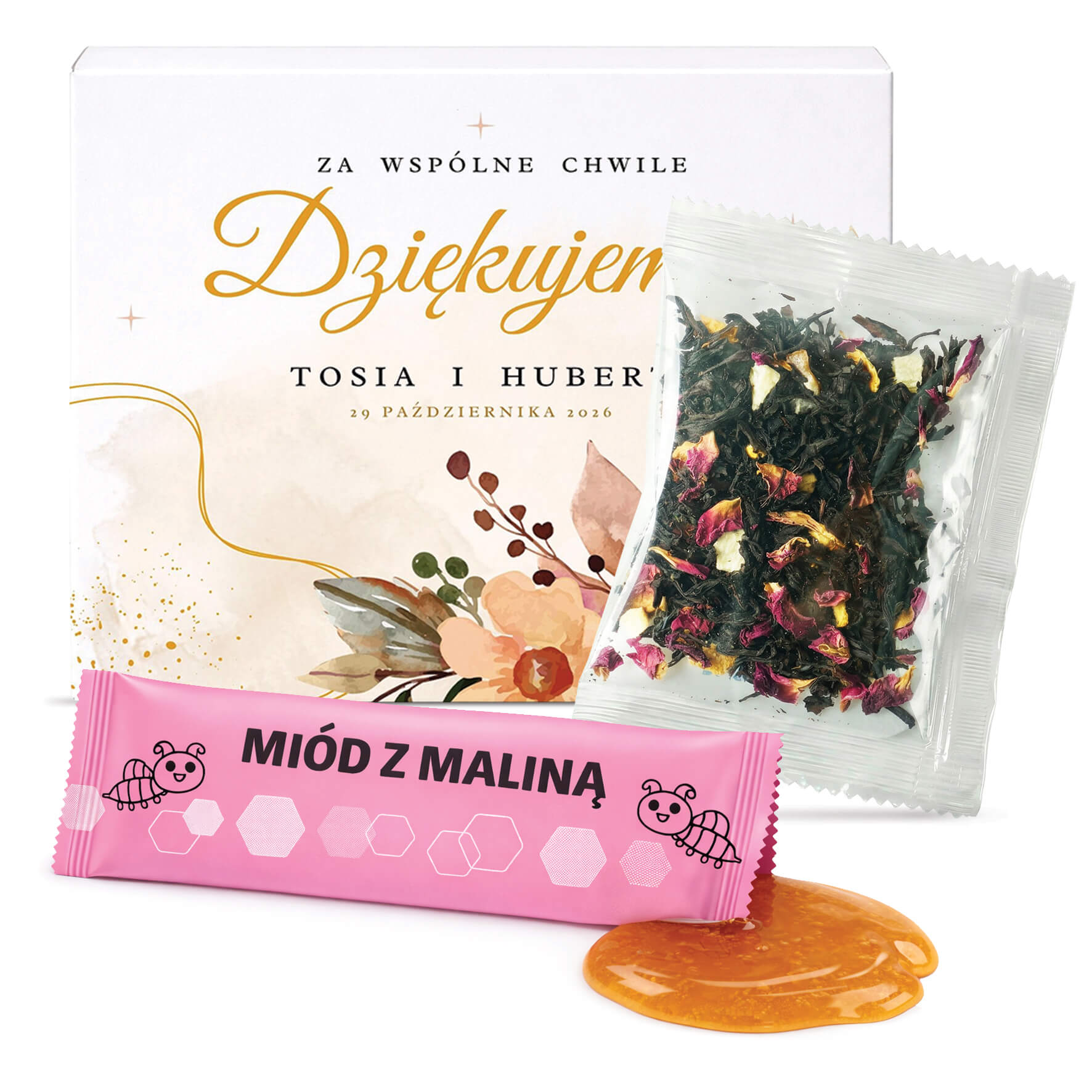 Podziękowanie dla gości upominek ślub wesele komunia chrzest zestaw miód z maliną i herbata w pudełku z nadrukiem